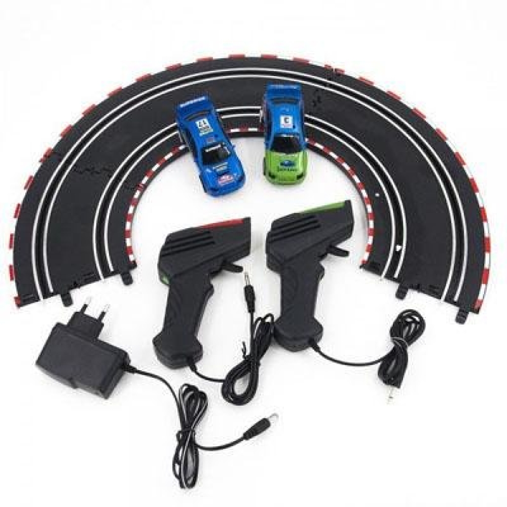Гоночный автотрек для детей с общей протяженностью трассы в 913 см. По треку ездят 2 машинки, управляемые пистолетным пультом. Подойдет для детей от 3-х лет. Трассу легко собрать и начать играть уже через полчаса, детали соединяются друг с другом одним щелчком.