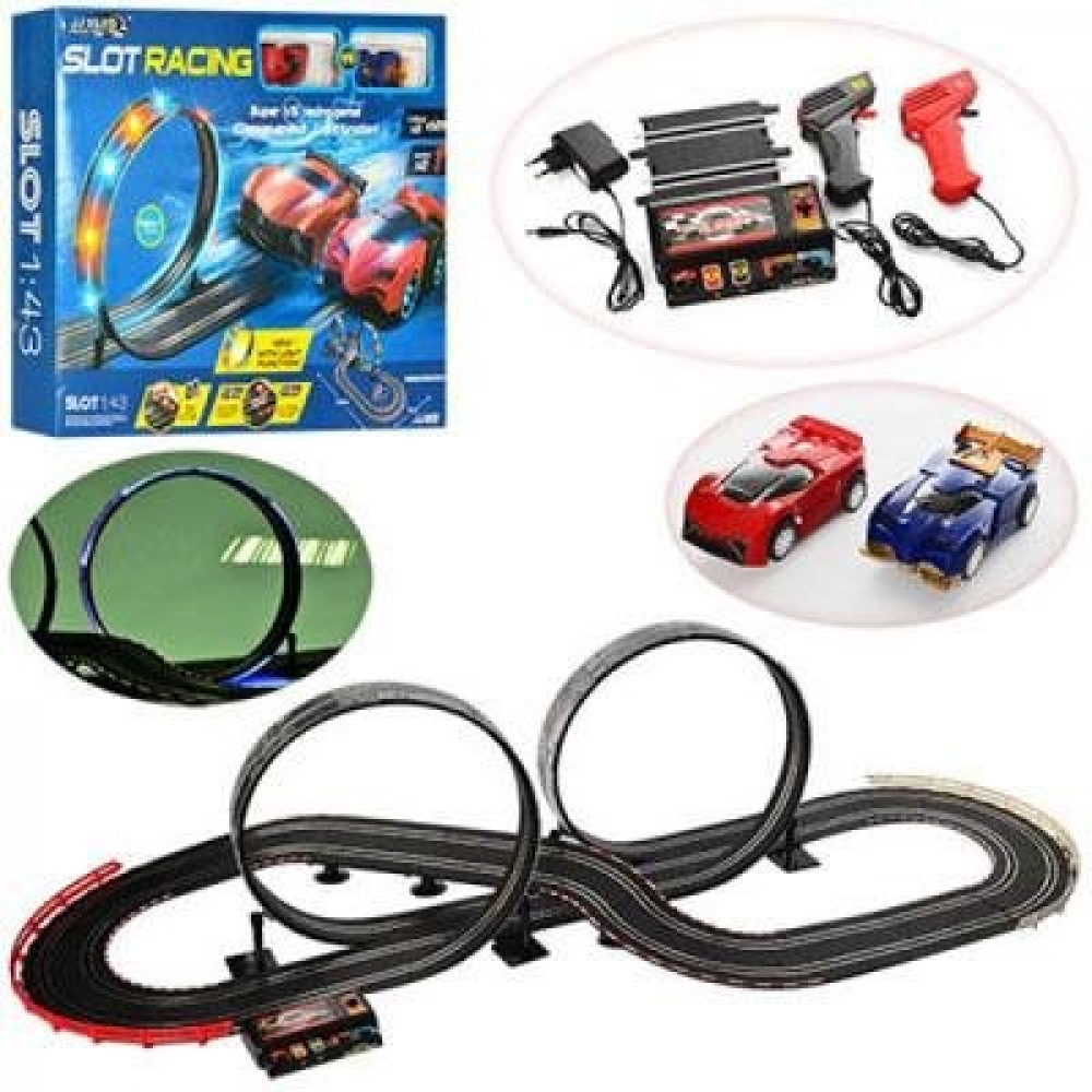 Гоночный автотрек для начинающих небольшого размера с увеличенной протяженностью трассы в 500 см. По треку ездят 2 машинки, управляемые пистолетным пультом. Трасса имеет 2 мертвых петли с яркой светодиодной подсветкой, а также несколько уровней и пересечений трасс. Управление полностью пропорциональное. Данная версия трека имеет звуковые эффекты. Подойдет для детей от 3-х лет. Трассу легко собрать и начать играть уже через полчаса, детали соединяются друг с другом одним щелчком.