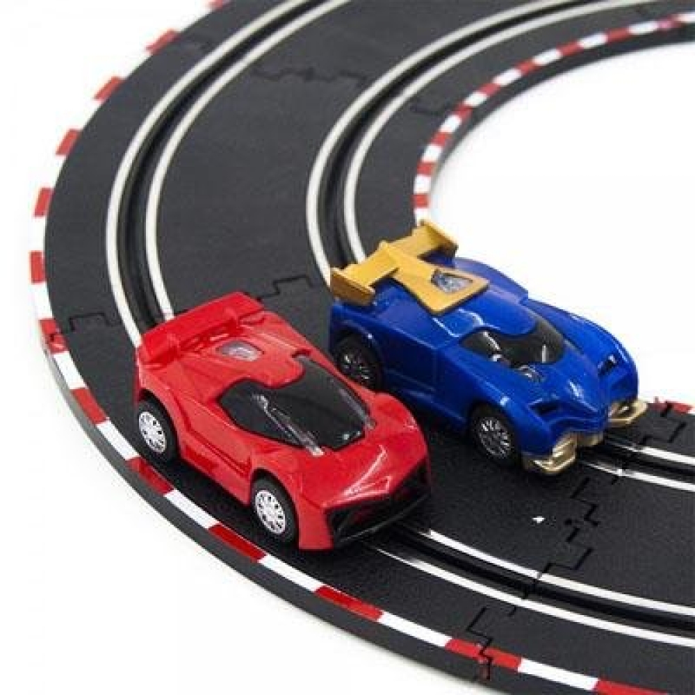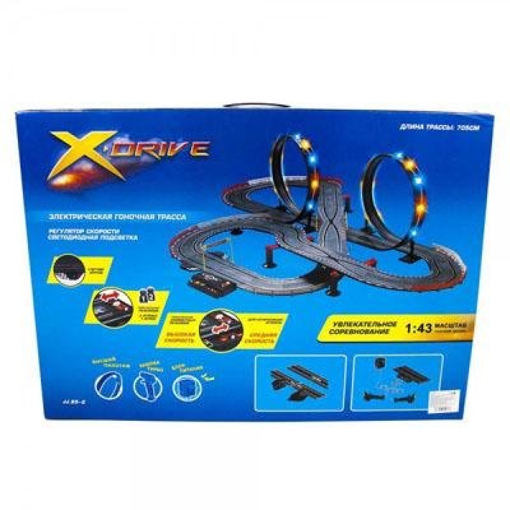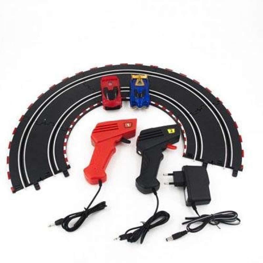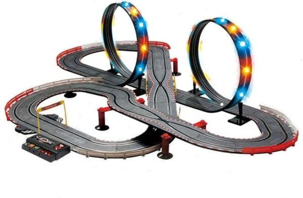 Гоночный автотрек для детей с общей протяженностью трассы в 705 см. По треку ездят 2 машинки, управляемые пистолетным пультом. Маршруты машинок периодически пересекаются. Трасса имеет яркую светодиодную подсветку. Подойдет для детей от 3-х лет. Трассу легко собрать и начать играть уже через полчаса, детали соединяются друг с другом одним щелчком.