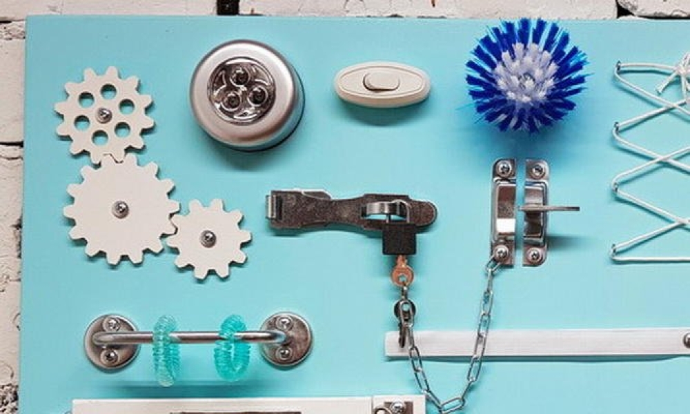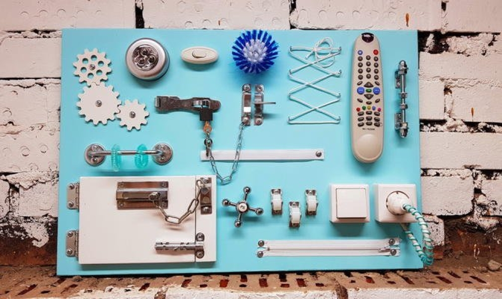 фонарик, шестеренки, щетка, молния, штанга с гайками, вентиль, звоночек велосипедный, дверцы, цепочки, колесики, розетка, вилка, шпингалет, выключатель большой, выключатель малый, щетка, шнуровка, пульт со светодиодом, замочек с ключами, дверная, ручка с кольцами/резинками, а так же сюрприз за каждой дверкой для малыша