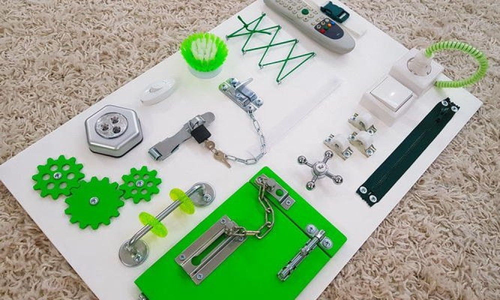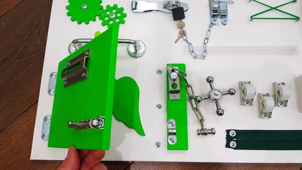 фонарик, шестеренки, щетка, молния, штанга с гайками, вентиль, звоночек велосипедный, дверцы, цепочки, колесики, розетка, вилка, шпингалет, выключатель большой, выключатель малый, щетка, шнуровка, пульт со светодиодом, замочек с ключами, дверная, ручка с кольцами/резинками, а так же сюрприз за каждой дверкой для малыша