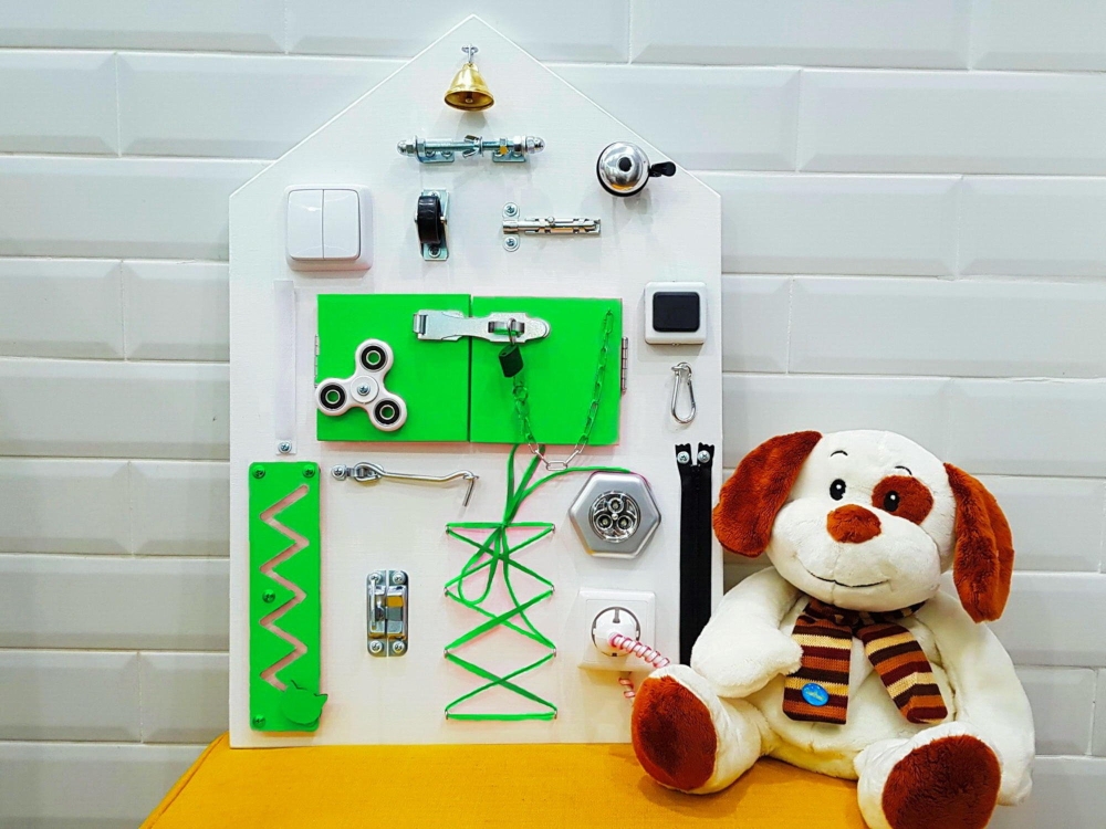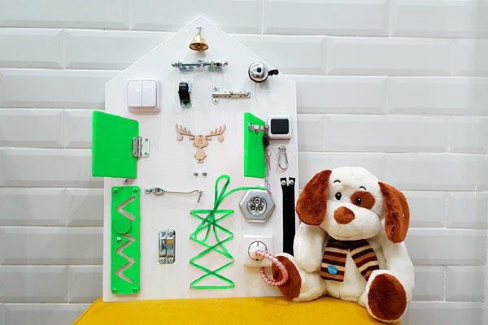 дверки, щеколды, фонарик, шпингалеты, штанка с различными гайками, липучка, шнуровки, розетка, вилка, молния, замочек, спиннер, колокольчик, велосипедный звоночек, выключатель, завертка, колесики,крючок, карабин, звонок, а так же сюрприз для малышей за каждой дверкой