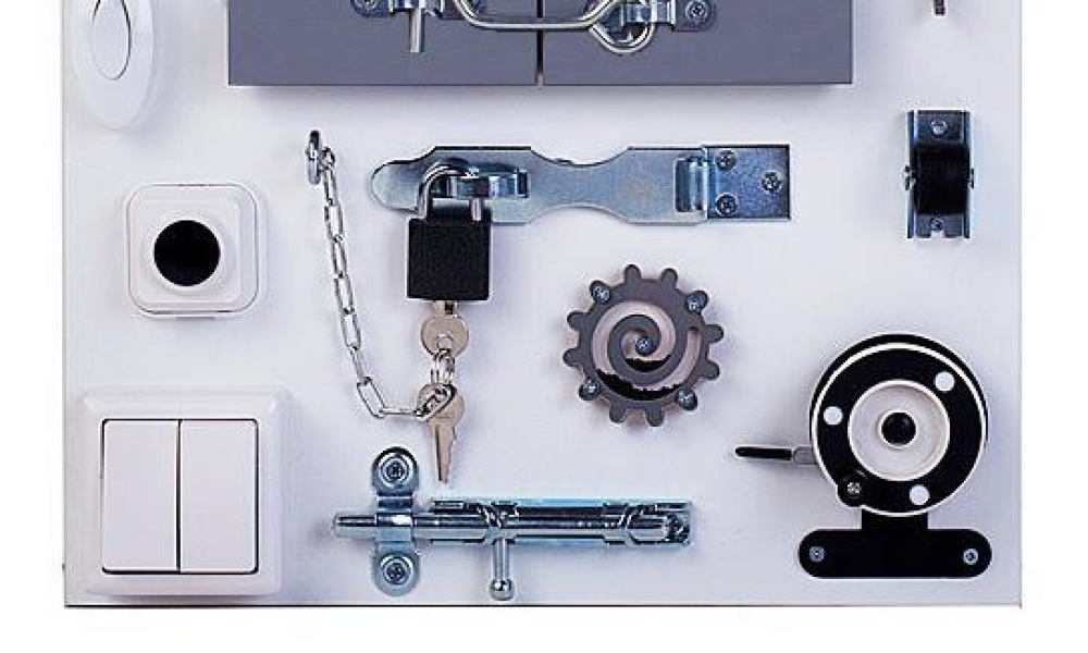 дверки, шестеренки, штанга с различными гайками, щеколда, фонарик, шпингалеты, розетка, молния, замочек, звоночек, выключатель, колесики, колокольчик, а так же сюрприз для малыша за каждой дверкой