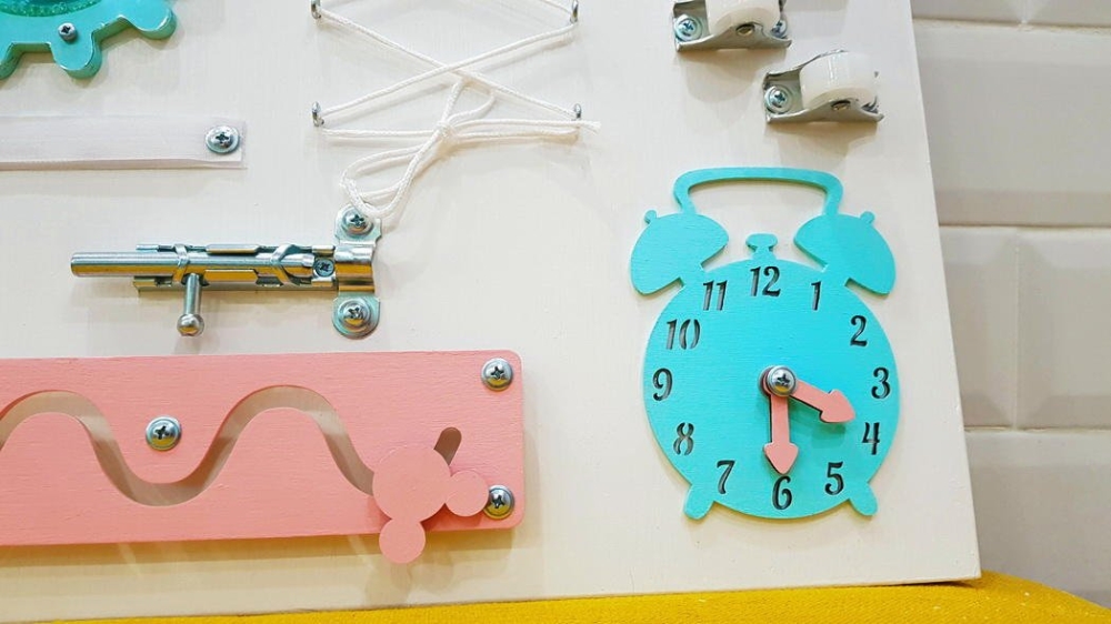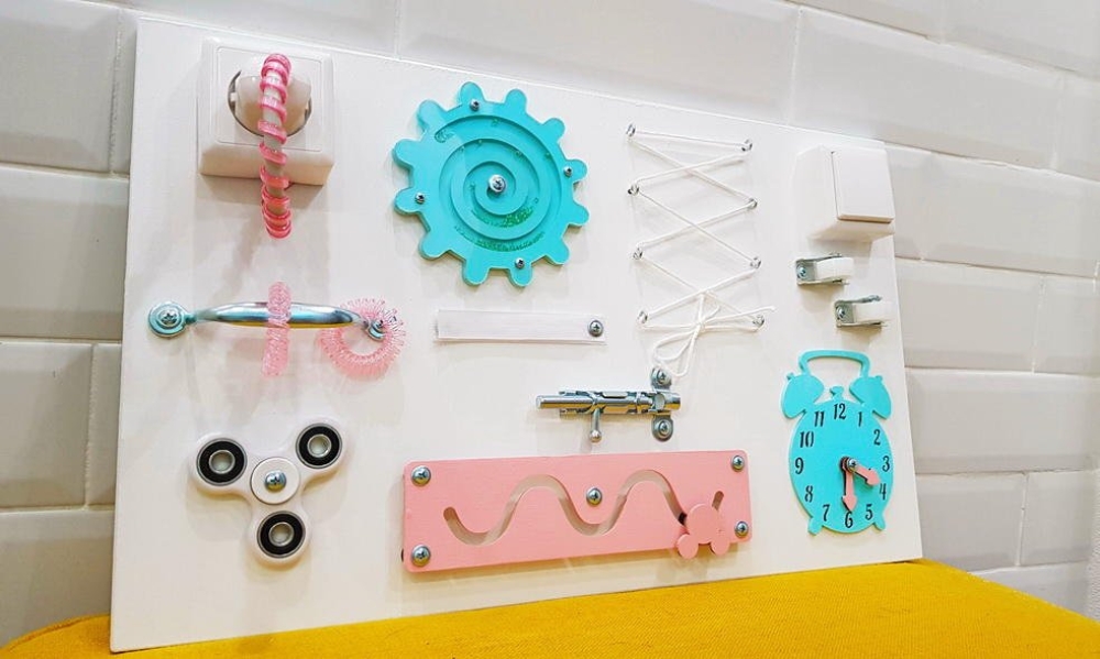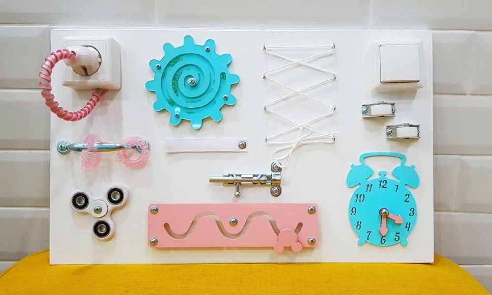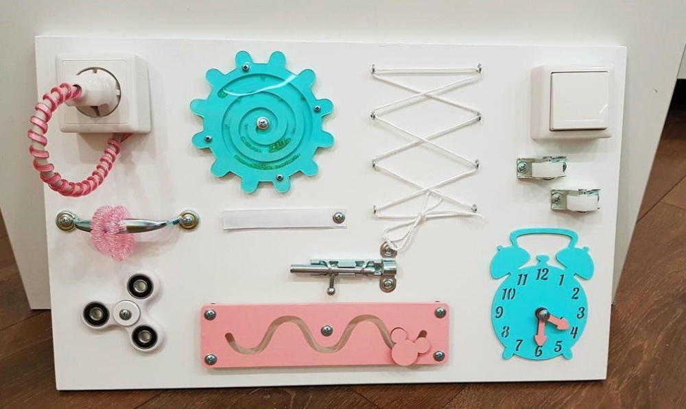 спиннер, шестеренка с бисером, лабиринт, шнуровка, часики, липучка, розетка, вилка, выключатель, колесики, шпингалет, дверная ручка, тактильные резинки
