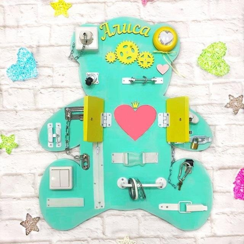 Такой подарок как бизиборд порадует как девочек, так и мальчиков в возрате от полугода до 5 лет. Игровые элементы доски обеспечивают всесторонее развитие ребенка и направлены на тренировку и развитие таких способностей как логика, память, мелкая моторика, воображение, ловкость, концентрация и многих других, а так же уберегает ребенка от травмоопасных ситуаций в период познания окружающего мира.
