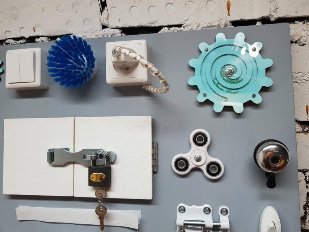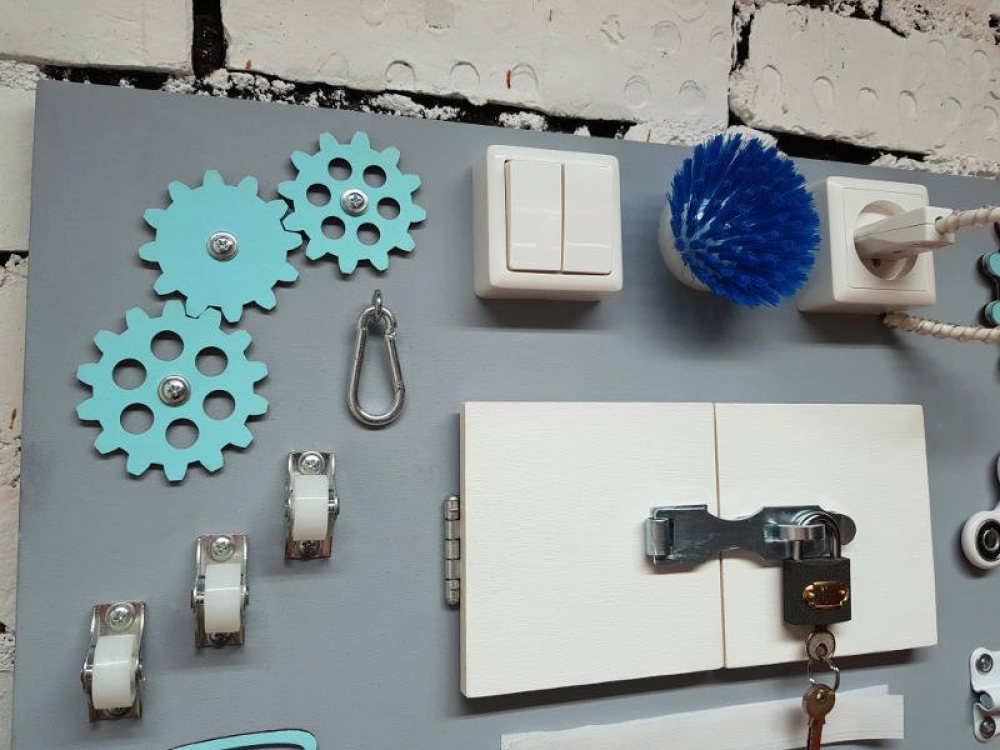 лабиринт, большая шестеренка под бисер, часики, шестеренки, спиннер, фонарик, щетка, липучка, звоночек велосипедный, дверцы, цепочки, колесики, розетка, вилка, шпингалет, выключатели, замочек, ключики, карабин, завертка и приятный сюрприз для малыша за дверкой!