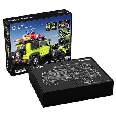 CaDa - это бренд производителя игрушек Double Eagle Group. В наборе C62001W предоставляется 1803 детали для сборки автомобиля SUZUKI JIMNY SIERRA в масштабе 1:12. У автомобиля много деталей, в набор входят: велосипед, лодка, ящик с инструментами, канистра, аптечка, радио, сумка и домкрат. Их можно перевозить на крыше. Капот, двери и багажник открываются, под капотом находится двигатель. Дополнительно можно установить комплект электроники, превратив автомобиль в радиоуправляемую модель.