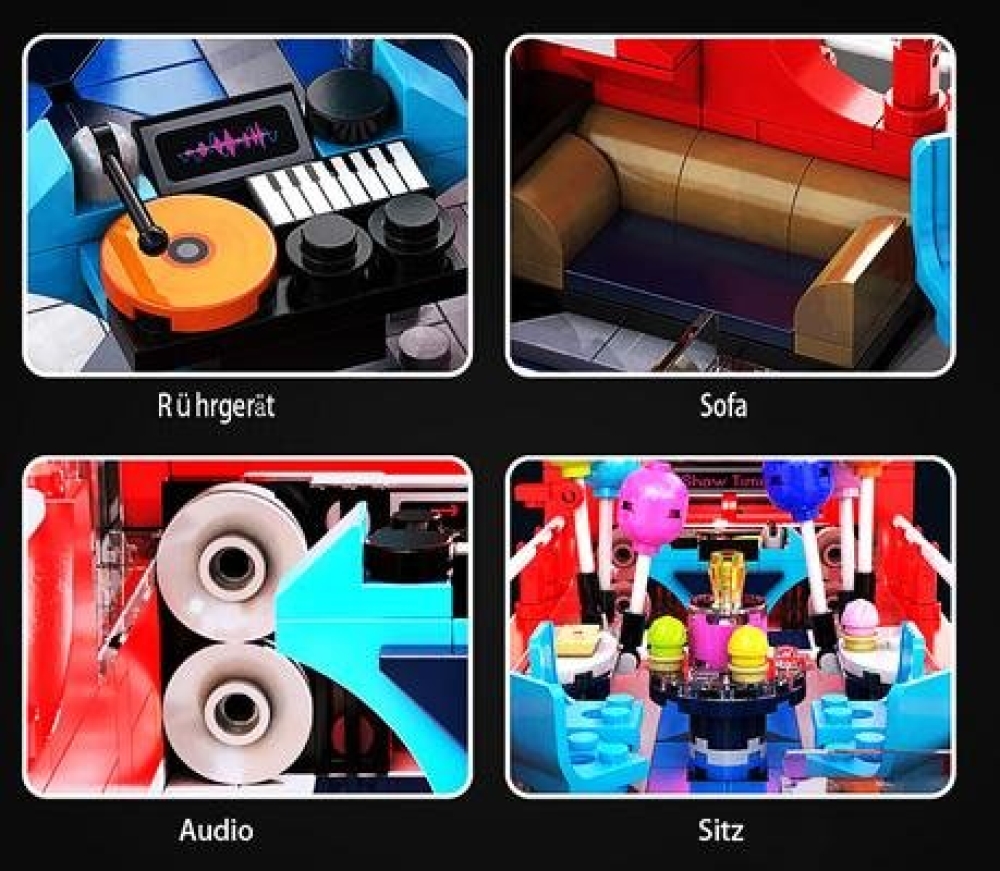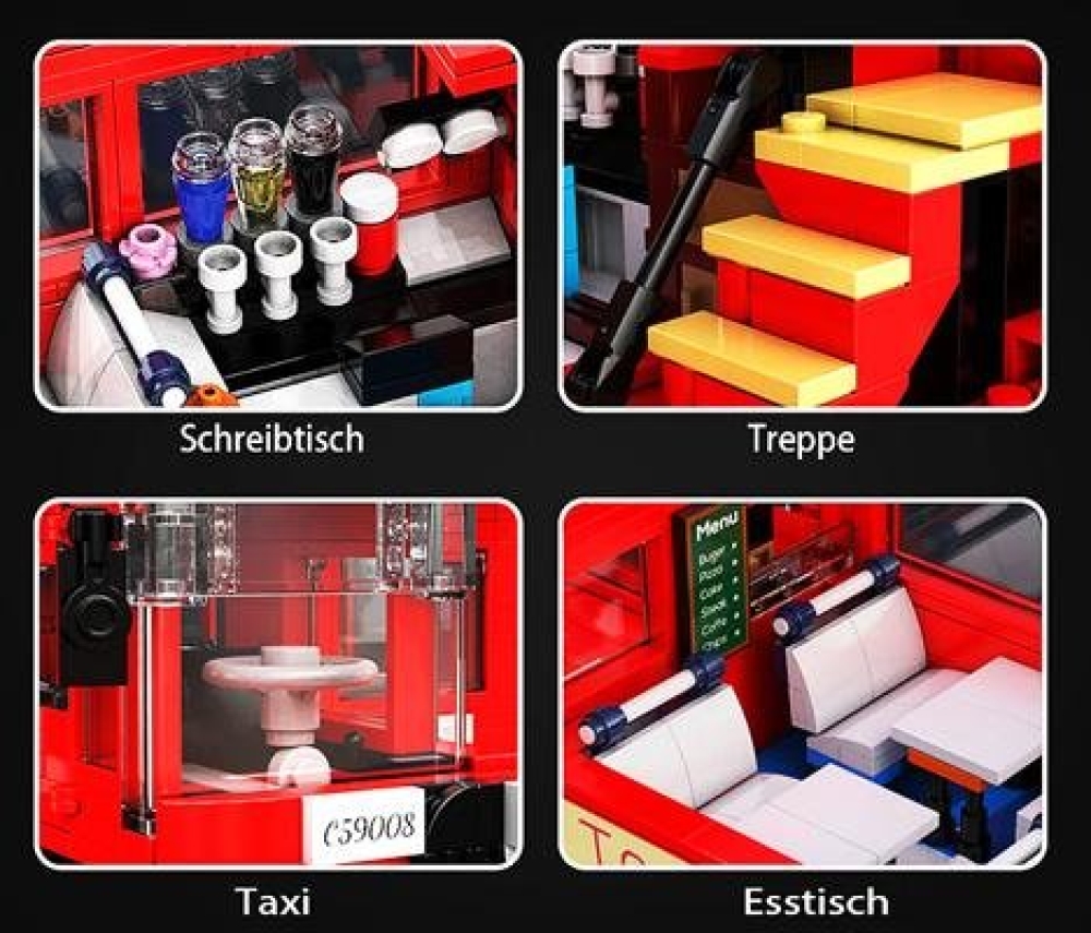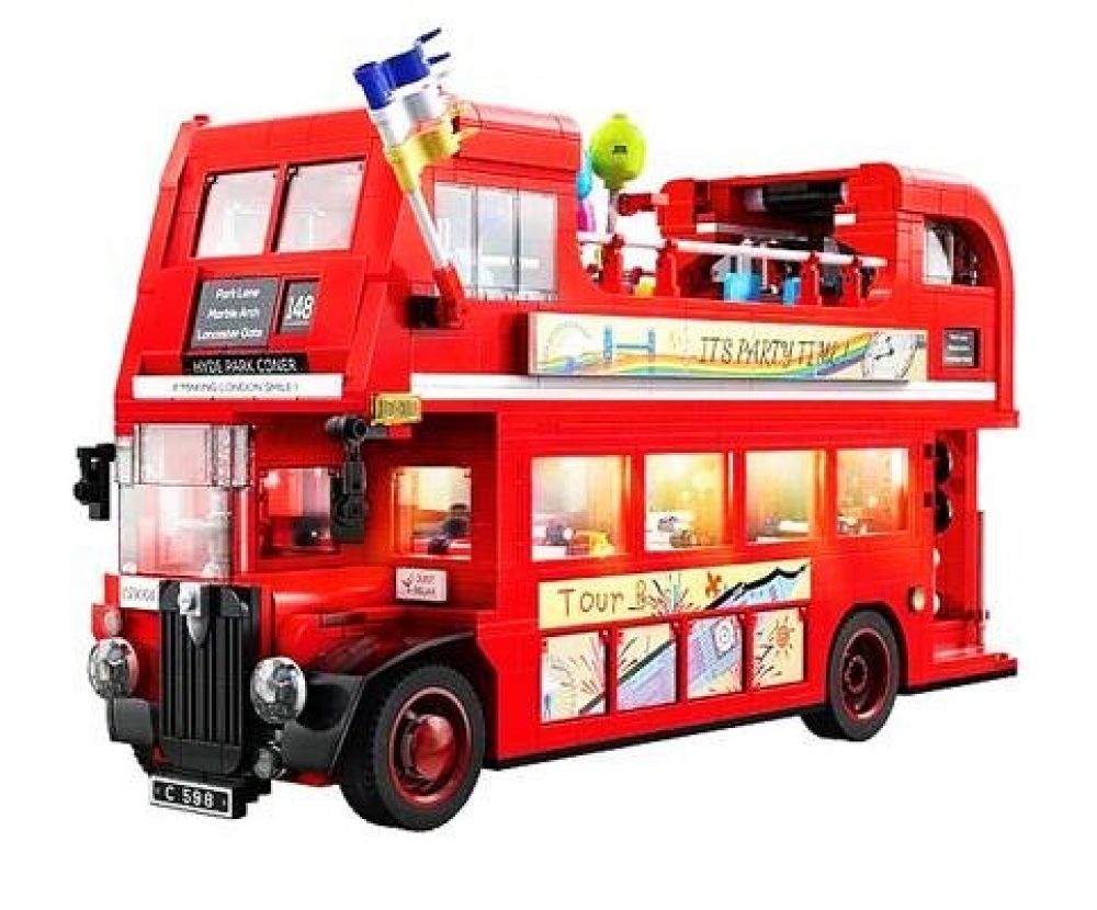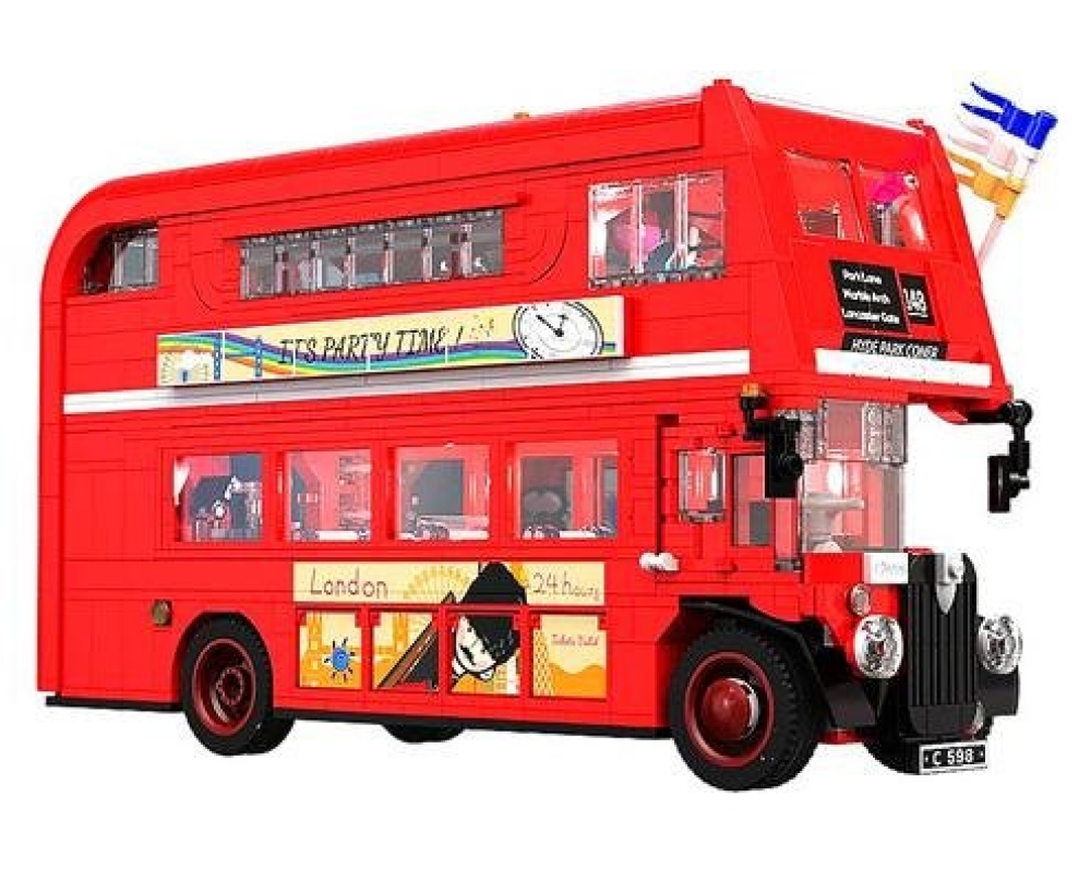 CaDa - это бренд производителя игрушек Double Eagle Group. В наборе C59008W предоставляется 1770 деталей для сборки лондонского винтажного туристического автобуса. У модели отличная степень детализации, очень проработанный внутренний интерьер. Цвет автобуса - красный. Установка двигателя не предусмотрена, но в комплекте идет подсветка для внутреннего интерьера. Структура модели - модульная, можно снимать стенки автобуса для доступа к элементам салона. Дверца на крыше автобуса открывается.