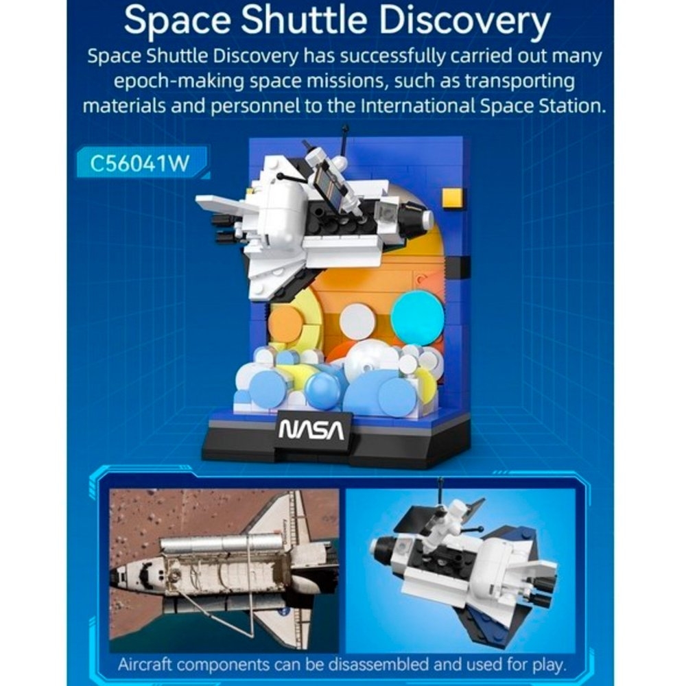 - Набор CaDA NASA 'Space Shuttle Discovery' представляет собой детализированную модель, состоящую из 250 деталей. Этот набор с удивительной точностью передает суть культового космического самолета. Компоненты самолета можно разобрать и использовать для игры.