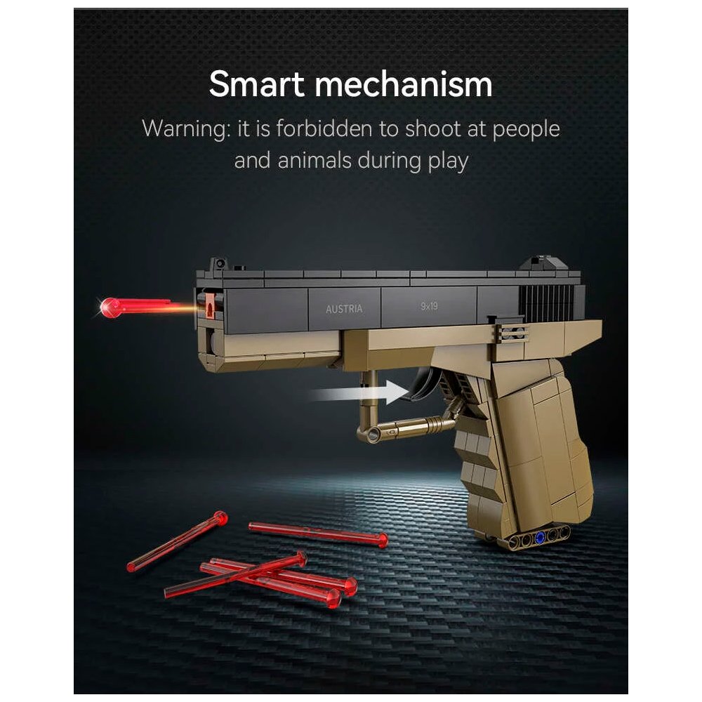 Конструктор от CADA для сборки модели пистолет 17 Pistol из 338 деталей. Подвижные элементы, стреляет пульками.