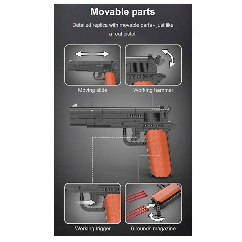 Конструктор от CADA для сборки модели пистолета Colt M1911 из 332 деталей. Имеет подвижные раму затвора и курок. В комплекте шест снарядов для стрельбы.