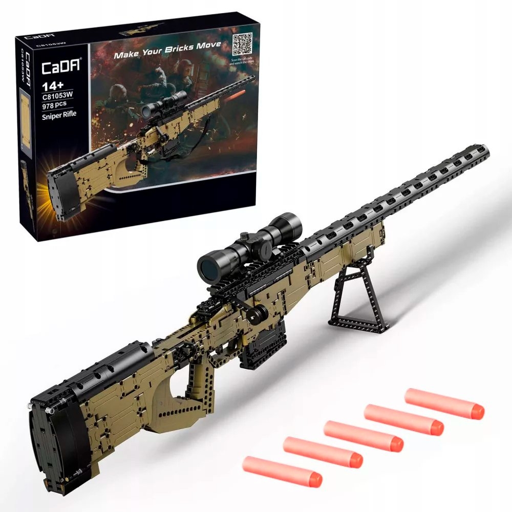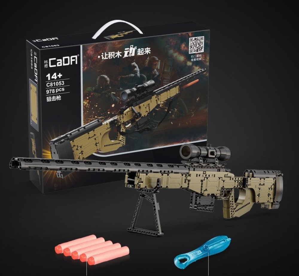 - Конструктор от CADA представляет собой набор для сборки модели снайперской винтовки AWM из 978 деталей. Можно примкнуть и отомкнуть магазин. Для стрельбы необходимо отпереть затвор, вложить снаряд для стрельбы в патронник и запереть затвор.