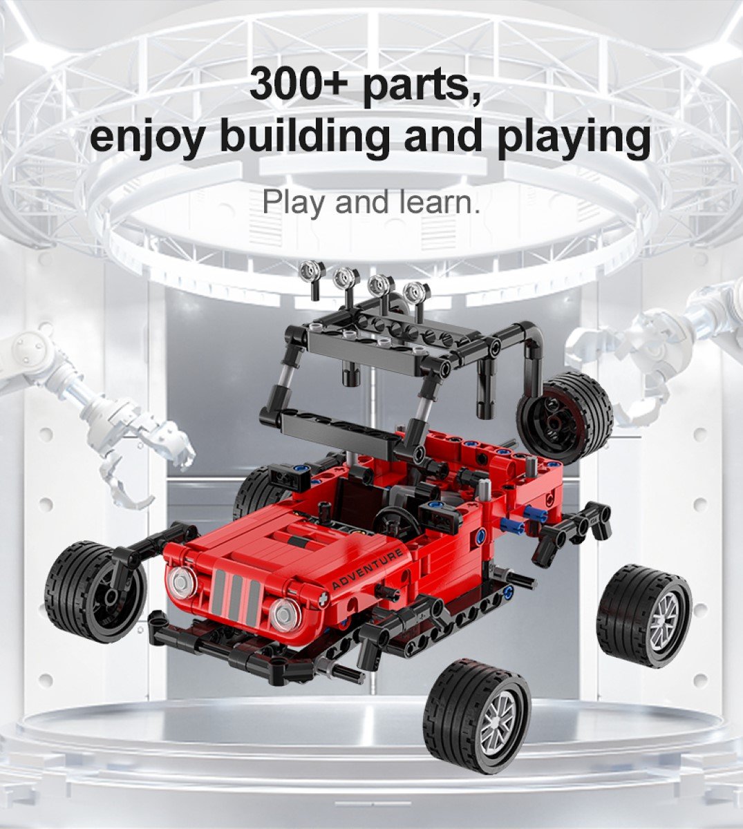 Конструктор от CADA представляет собой набор для постройки внедорожника Adventure из 317 деталей. Имеет стильный дизайн. Оснащен инерционным механизмом - достаточно откатить машинку назад и отпустить, чтобы она сама покатилась вперёд.
