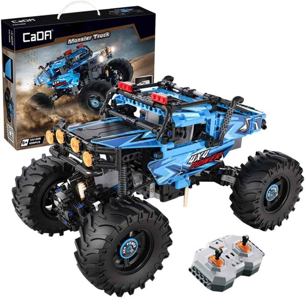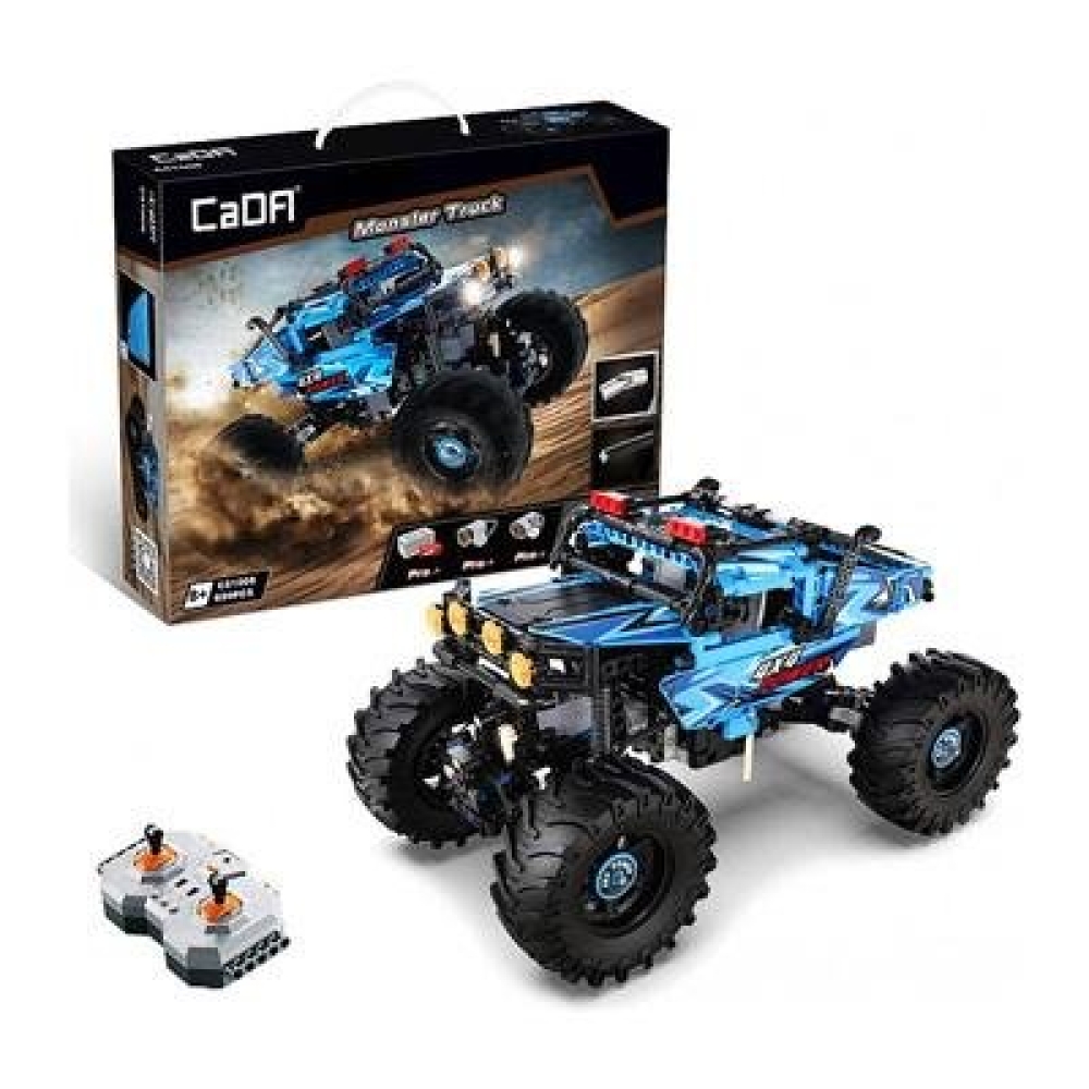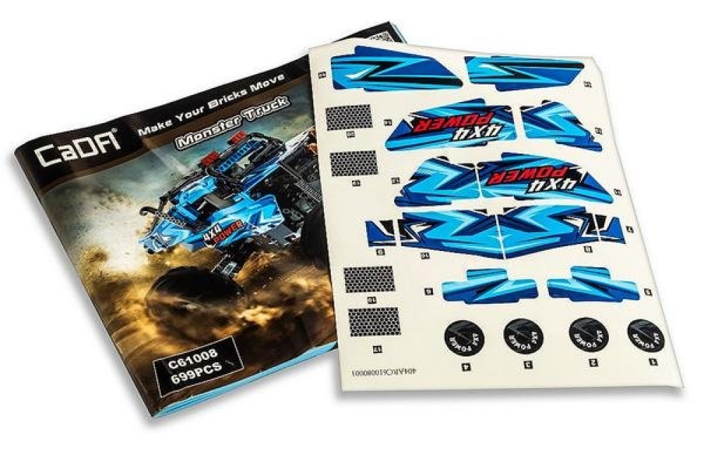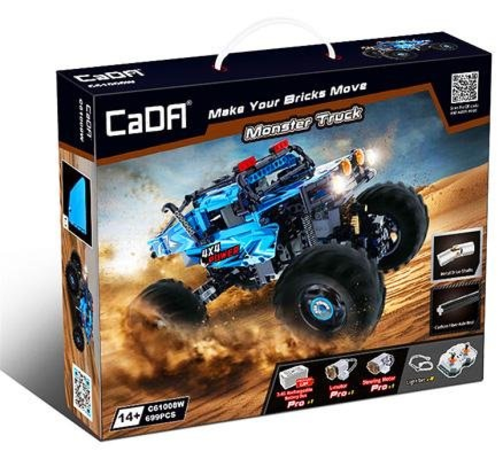 CaDa - это бренд производителя игрушек Double Eagle Group. В наборе C61008W предоставляется 699 деталей для сборки чёрно-синего внедорожника Монстр Трак. Помимо деталей корпуса, платы управления и колес, в комплекте идут пульт управления, приводной мотор, сервомотор, аккумуляторный бокс и светодиоды для подсветки двух фар. Пульт ДУ действует в радиусе 25 метров.
