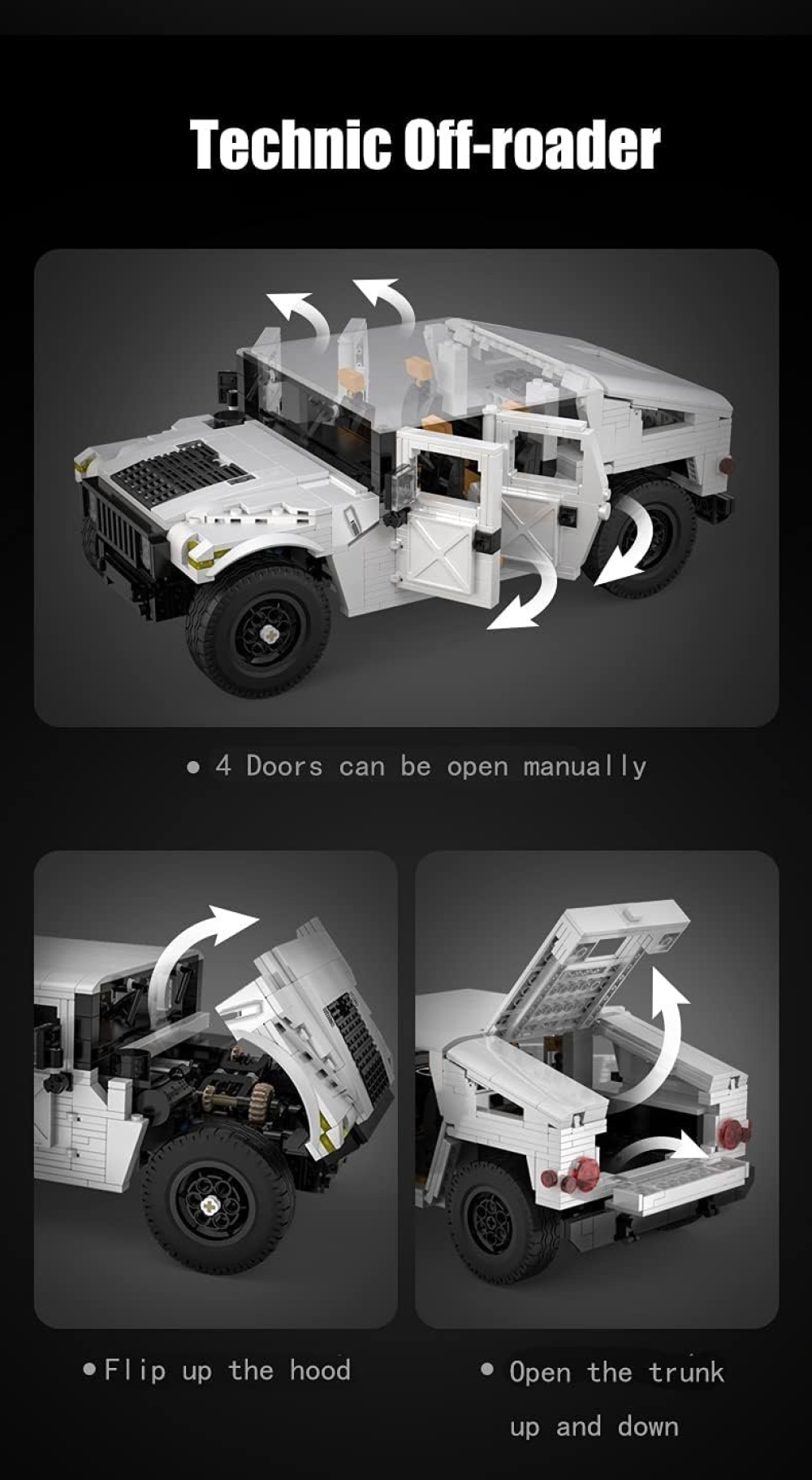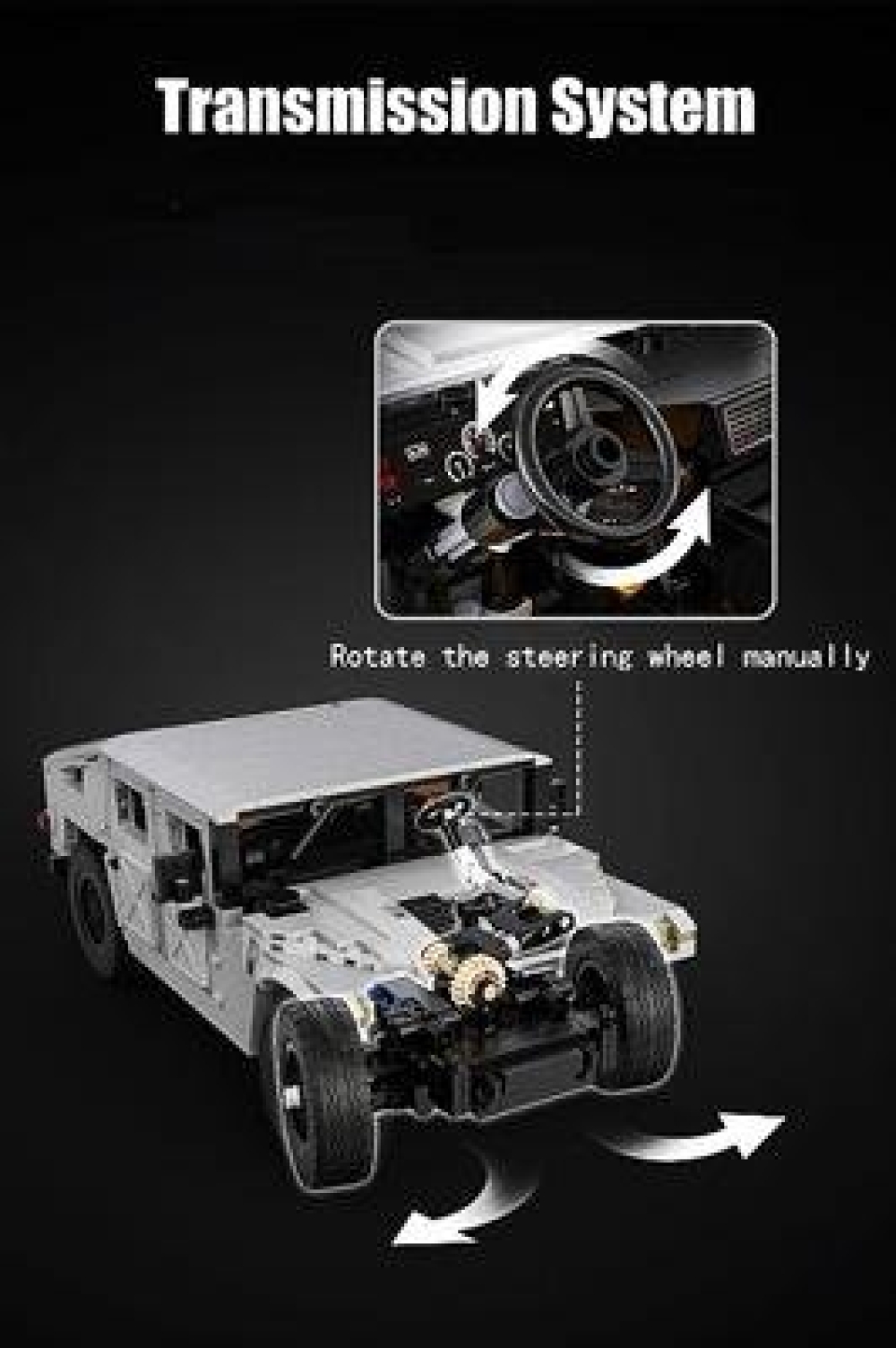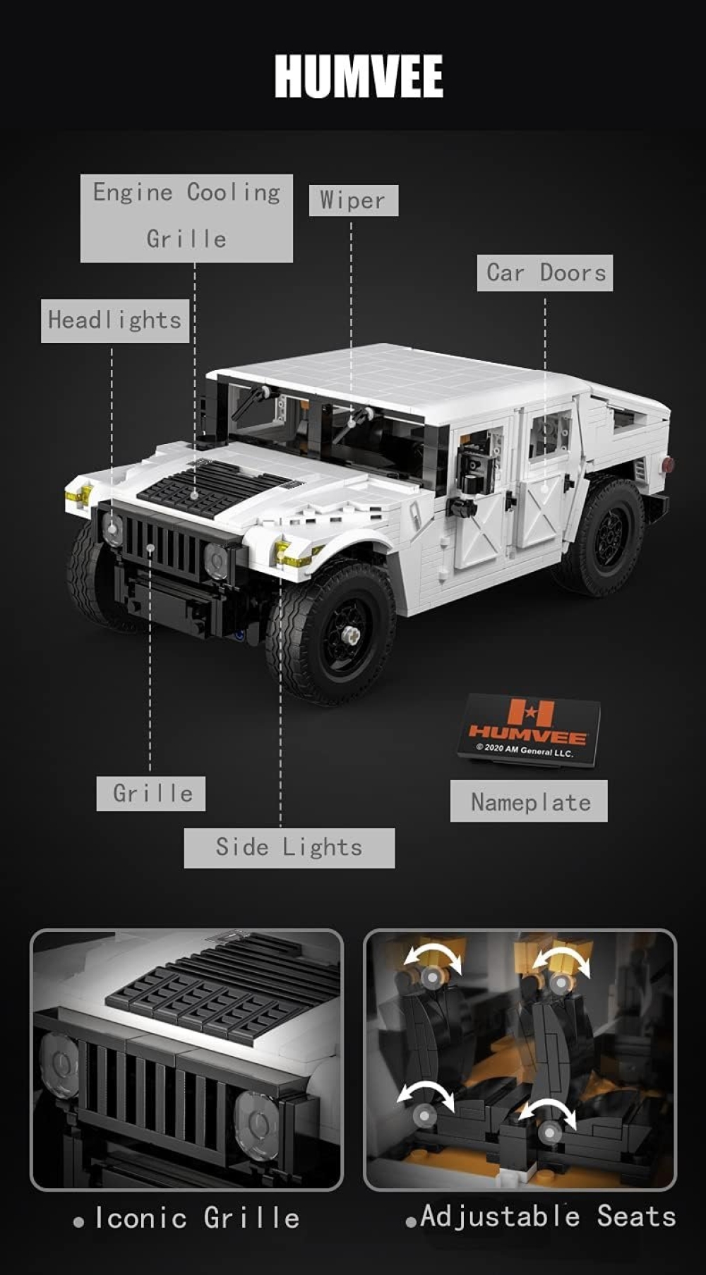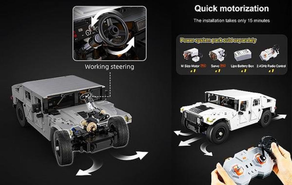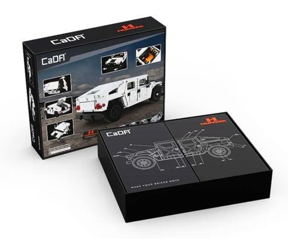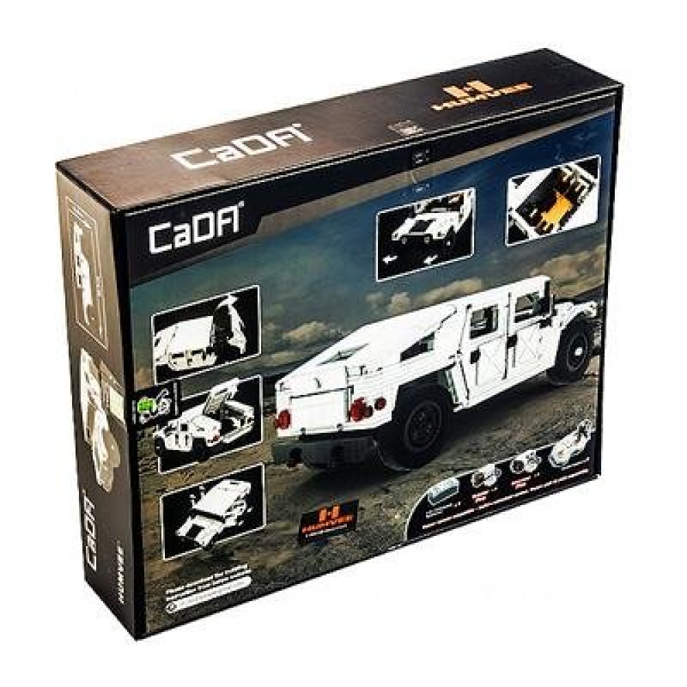 CaDa - это бренд производителя игрушек Double Eagle Group. В наборе C61027W предоставляется 1380 деталей для сборки военного бронированного автомобиля HumVee в масштабе 1:12. У модели детализированный внутренний интерьер. Сиденья регулируются, двери, капот и багажник открываются. Под капотом находится двигатель. Имеется рулевое управление. Дополнительно можно установить комплект электроники, превратив автомобиль в радиоуправляемую модель.