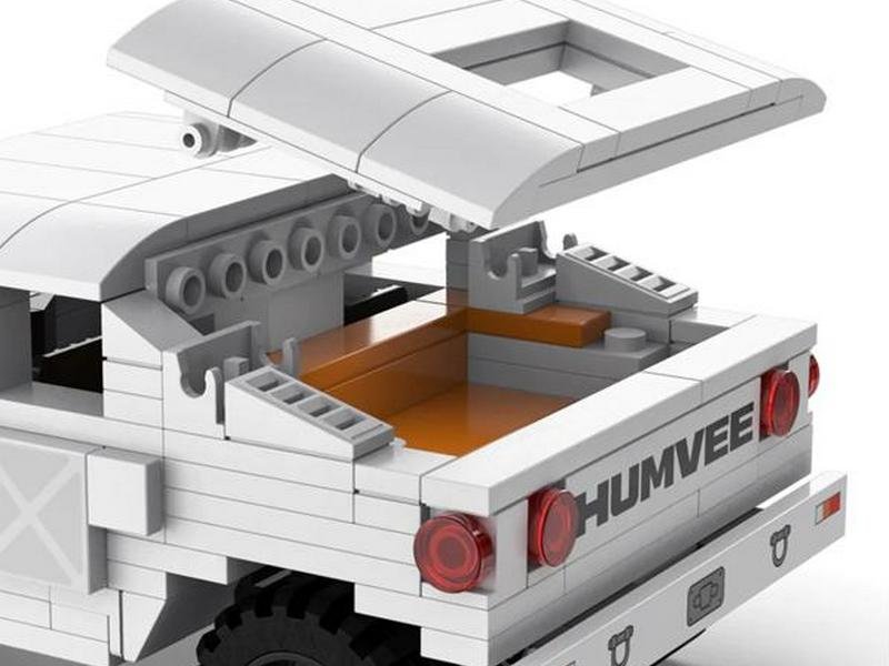 Конструктор от CADA представляет собой набор для постройки военного бронированного автомобиля HumVee из 328 деталей в масштабе 1/24. Открывается багажник.