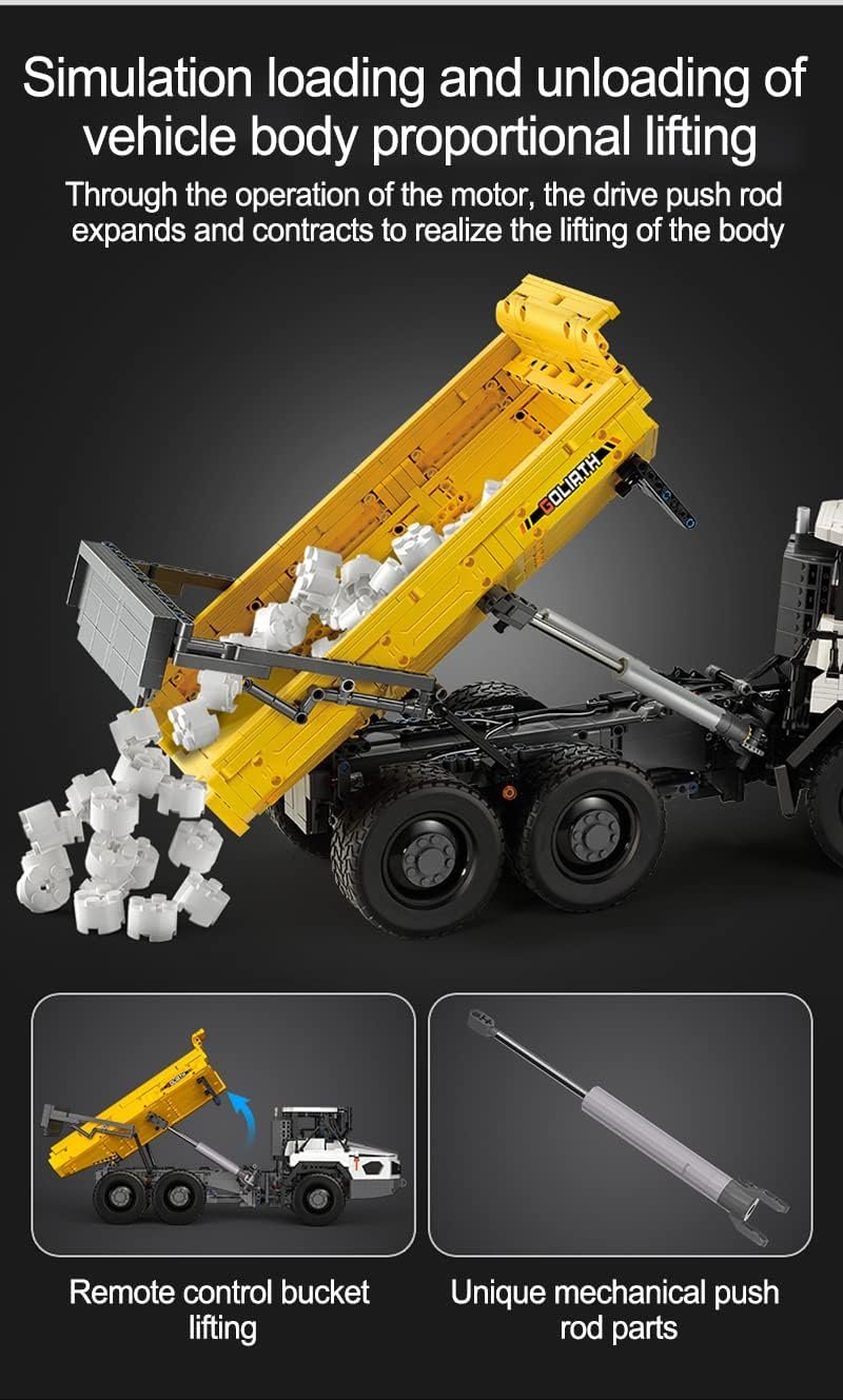 Радиоуправляемый конструктор от CADA представляет собой набор для постройки самосвала Голиаф из 3067 деталей в масштабе 1/17. Кузов самосвала поднимается, заслонка кузова открывается. Капот можно открыть, под ним у самосвала шестицилиндровый двигатель. Подвеска машины позволяет ей проезжать даже по неровным поверхностям.