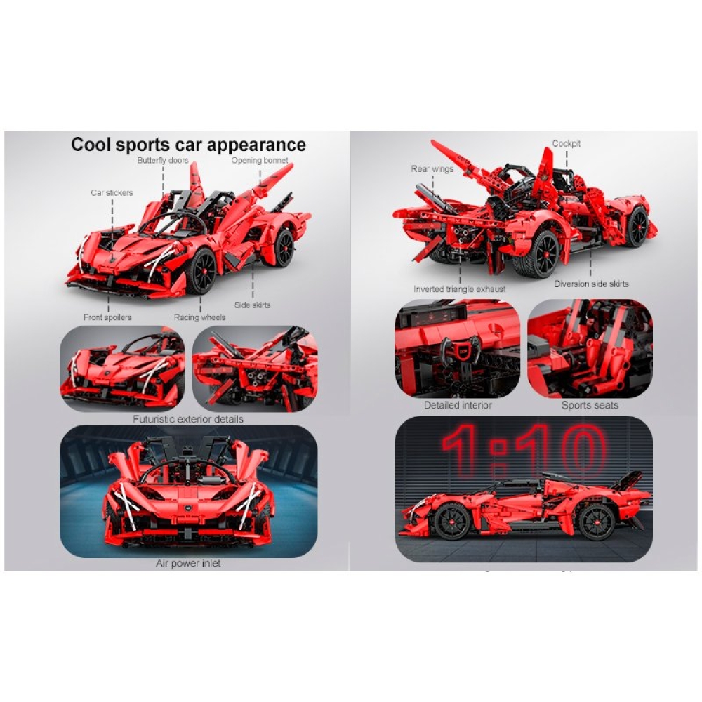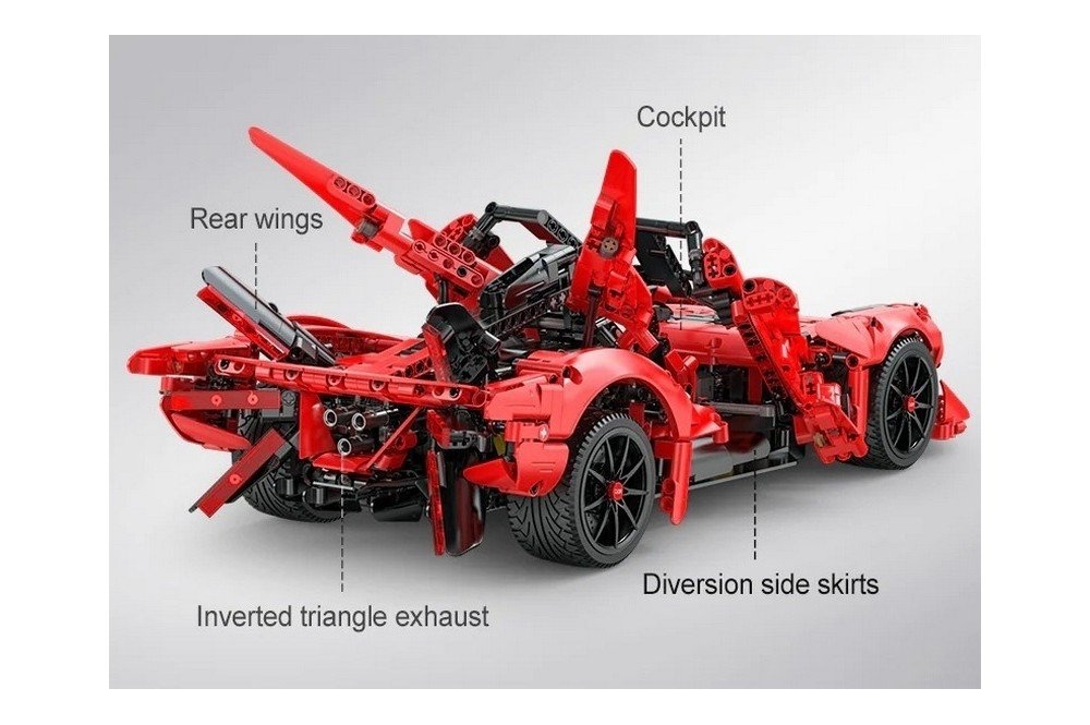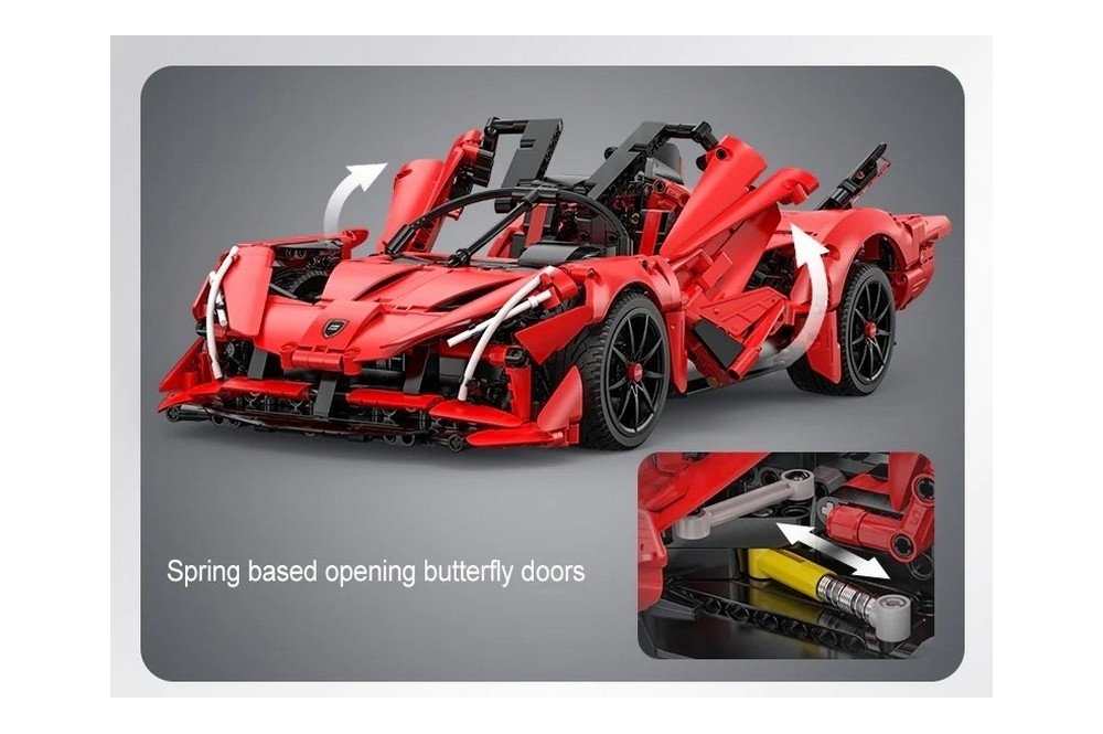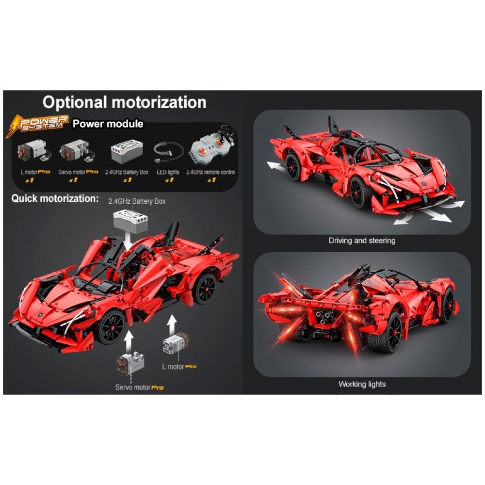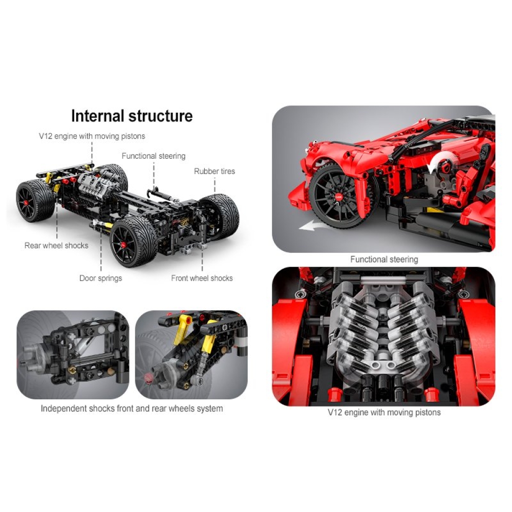 Независимая передняя и задняя подвеска, рулевое управление и двигатель V12 создают реалистичные ощущения от вождения. Левая и правая двери могут открываться по отдельности и запираться пружиной. Электрический модуль может быть добавлен для реализации функции дистанционного управления, что делает игру еще более увлекательной. Световой модуль можно использовать для освещения шести частей заднего фонаря, добавляя последний штрих к и без того впечатляющей конструкции.