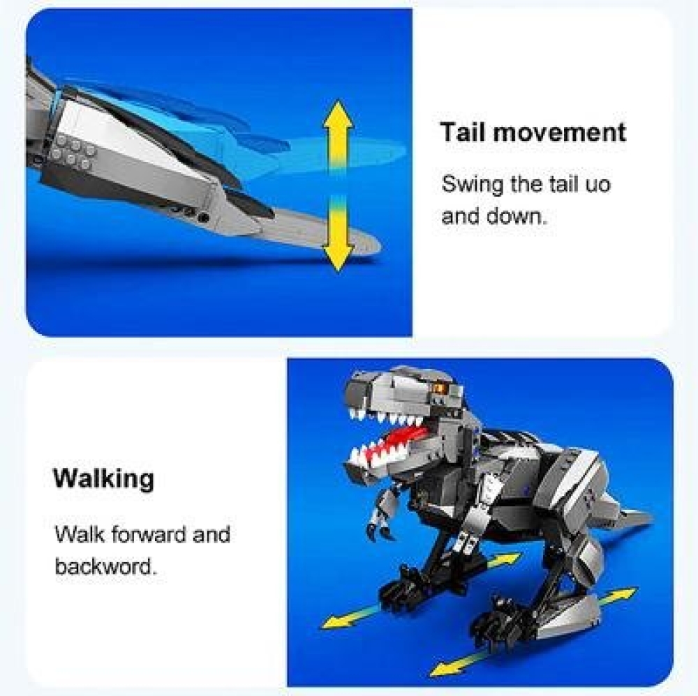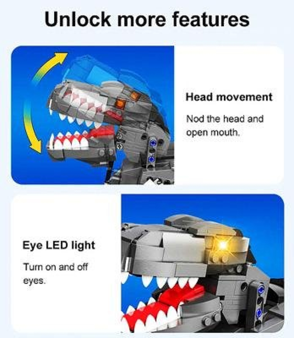 Детали выполнены из качественного пластика, прекрасно скрепляются и легко снимаются, а схема сборки спроектирована так, чтобы получившаяся модель была прочной и не рассыпалась при движении и падениях с небольшой высоты. Динозавр подвижный, у него открывается пасть, поворачиваются голова и хвост. Конструктор безопасен для детей от 6 лет.