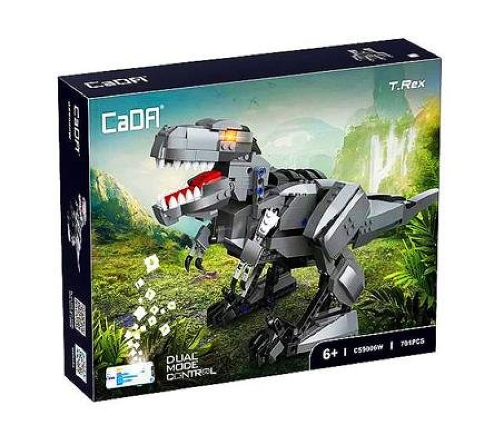 CaDa - это бренд производителя игрушек Double Eagle Group. В наборе C59006W предоставляется 701 деталь для сборки серого робота-тираннозавра. В комплекте идут: инструкция по сборке, аккумуляторная батарея, пульт управления - так что этот конструктор является полноценной радиоуправляемой моделью. В комплекте есть подсветка, с помощью которой подсвечиваются глаза игрушки. Динозавром можно управлять как с пульта управления, так и с помощью приложения на телефоне. Пульт ДУ действует в радиусе 25 метров.