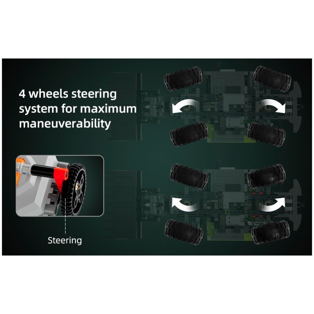 CaDa - это бренд производителя игрушек Double Eagle Group. В наборе C61008W предоставляется 699 деталей для сборки чёрно-синего внедорожника Монстр Трак. Помимо деталей корпуса, платы управления и колес, в комплекте идут пульт управления, приводной мотор, сервомотор, аккумуляторный бокс и светодиоды для подсветки двух фар. Пульт ДУ действует в радиусе 25 метров.