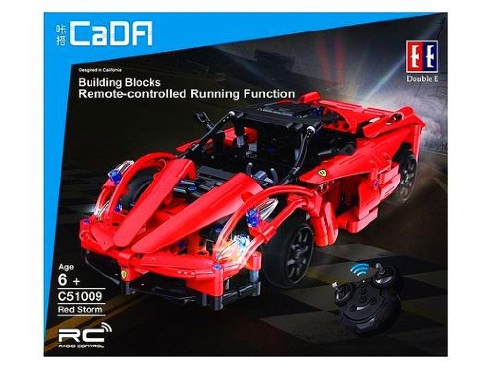 CaDa - это бренд производителя игрушек Double Eagle Group. В наборе C51009W предоставляется 380 деталей для сборки спортивного автомобиля Ferrari Red Storm. В комплекте идут электродвигатель, пульт управления 2,4 ГГц, аккумулятор 400 мАч и зарядное устройство - так что набор в собранном состоянии является полноценной радиоуправляемой моделью, готовой покорять трассу. Пульт действует в радиусе 30 метров.