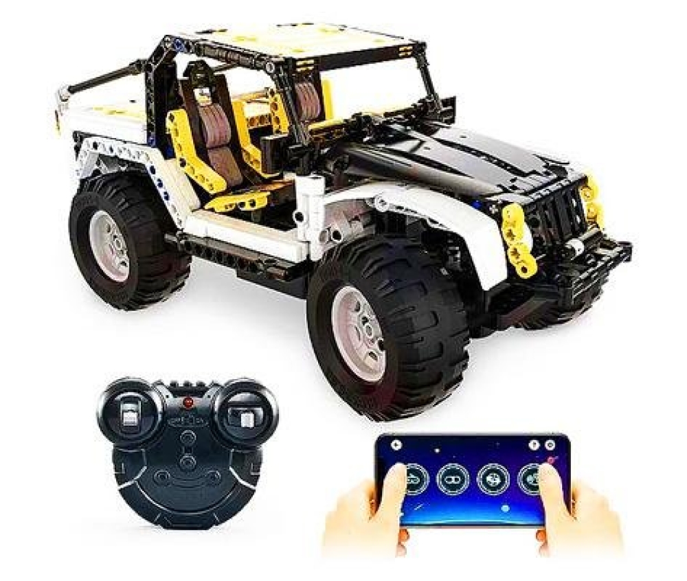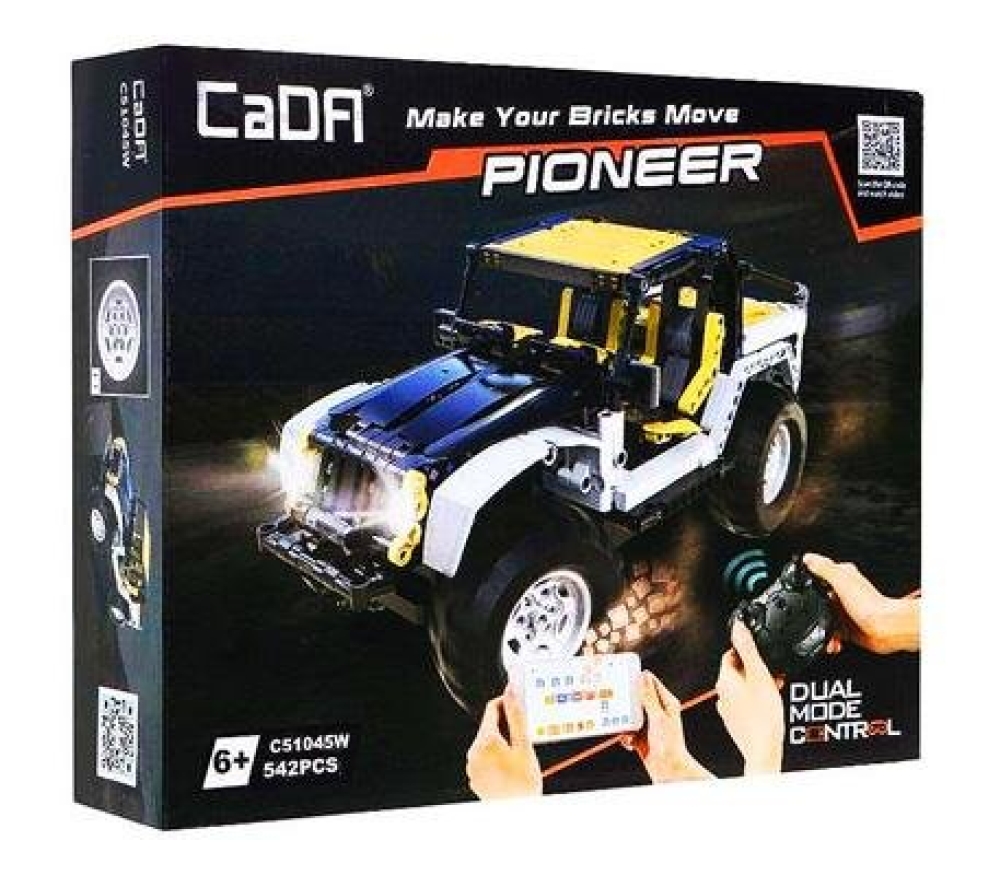 CaDa - это бренд производителя игрушек Double Eagle Group. В наборе C51045W предоставляется 542 детали для сборки внедорожника Jeep Wranger Pioneer. В комплекте идет пульт управления, а питание осуществляется от батареек (батарейки в комплект не входят) и аккумулятора - так что набор в собранном состоянии является полноценной радиоуправляемой моделью, готовой покорять трассу. Внешний вид и внутренний интерьер машины отлично детализирован - есть водительское и пассажирское сиденья, капот и багажник. Пульт ДУ действует в радиусе 25 метров - машинка управляется с него или по Bluetooth. Также есть светодиодные фары и задние стоп-сигналы.