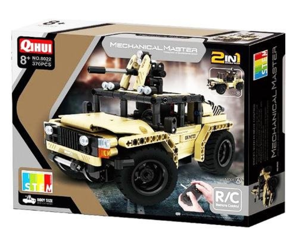 В наборе военный джип QiHui 370 деталей (2в1, пульт) - QH8022 - предоставляется 370 деталей для сборки игрушки-трансформера 2-в-1. Серия QiHui повторяет знаменитую серию Техникс. В этом наборе предлагается собрать два варианта военной машины-джипа.
