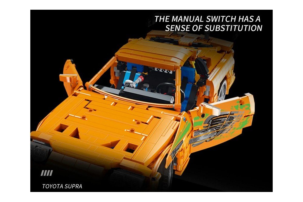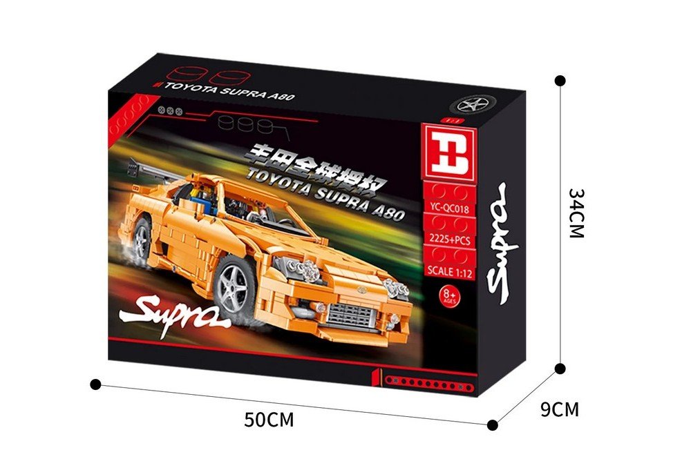 Конструктор представляет собой набор для постройки автомобиля TOYOTA SUPRA A80 из 2225 деталей от RCM. Капот, двери и багажник открываются, крыша снимается. Под капотом спортивный двигатель, в багажнике - мощная акустическая система и баллоны закиси азота. Колеса поворачиваются при повороте руля.