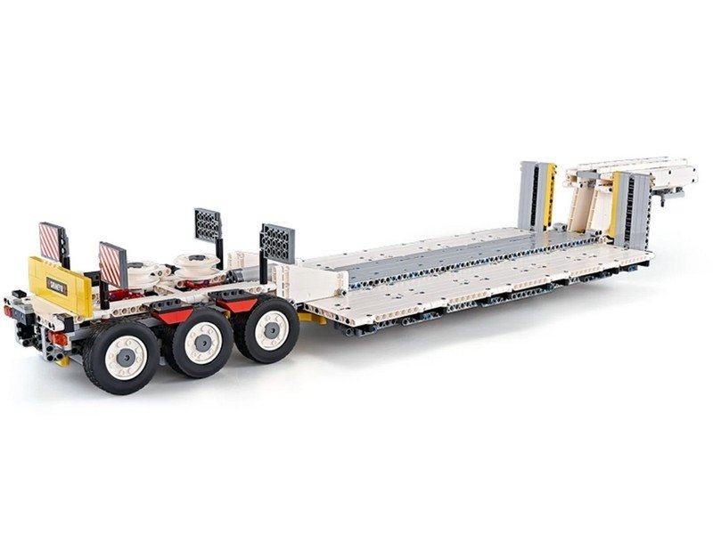 Конструктор для постройки прицепа для тягача YC-22013 из 1529 деталей от RCM. Повторяет характеристики настоящего прицепа. Можно установить двигатель, передняя часть платформы открывается. Задняя часть оборудована флажками.