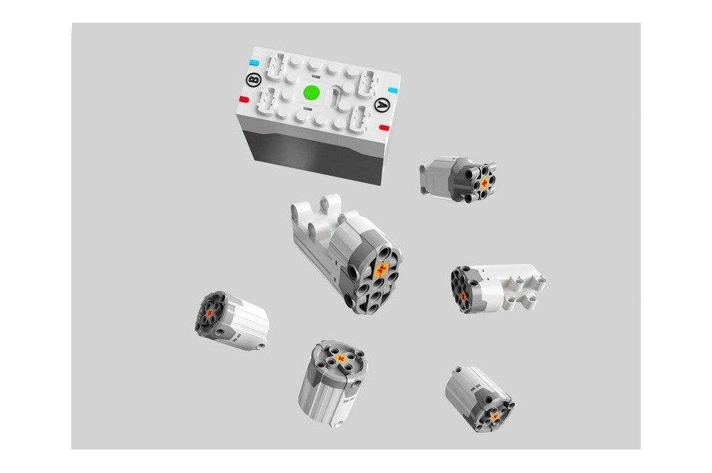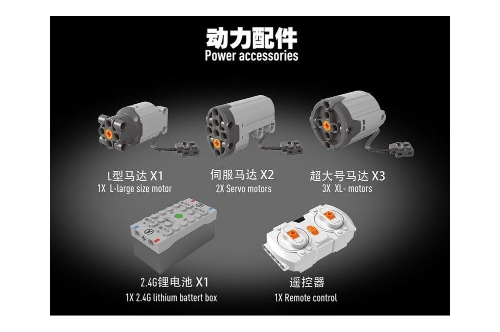 В комплекте набор электроники (мотор, серво, аккумулятор), который делает Ваш конструктор радиоуправляемым.