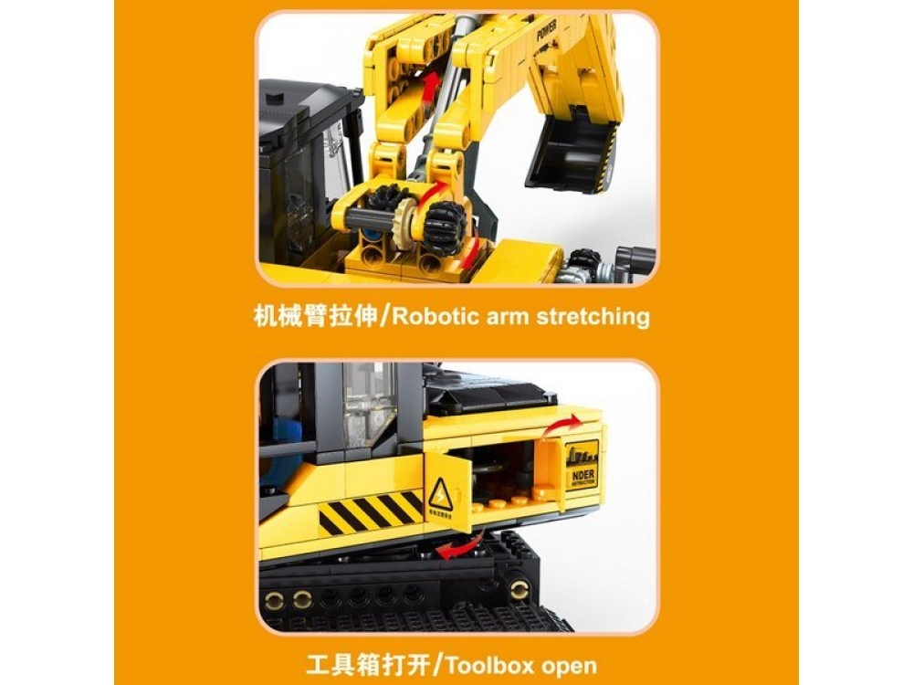 Радиоуправляемый конструктор представляет собой набор для постройки экскаватора из 686 деталей от RCM. Гусеничный трак обеспечивает наилучшее сцепление, а подвижный манипулятор с ковшом оснащён механическим приводом.