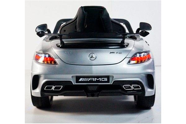 Mercedes-Benz SLS AMG Silver имеет черные диски с яркой покраской внутри. Дистанционное управление до 50 метров с помощью родительского пульта по Bluetooth. В базовой комплектации уже имеется аудио магнитола, к которой можно подключать USB/SD/Aux, а также есть FM радио. В машине есть открывающийся багажник, в котором ребенок может хранить свои любимые игрушки. Для уверенного разгона установлены 2 редуктора мощностью 35 ватт и емкий аккумулятор для 2 часов езды по пересеченной местности. Из салона можно включить свет фар, а также управлять мультимедиа. С помощью телескопической ручки можно перевозить авто по принципу чемодана. Из преимуществ: