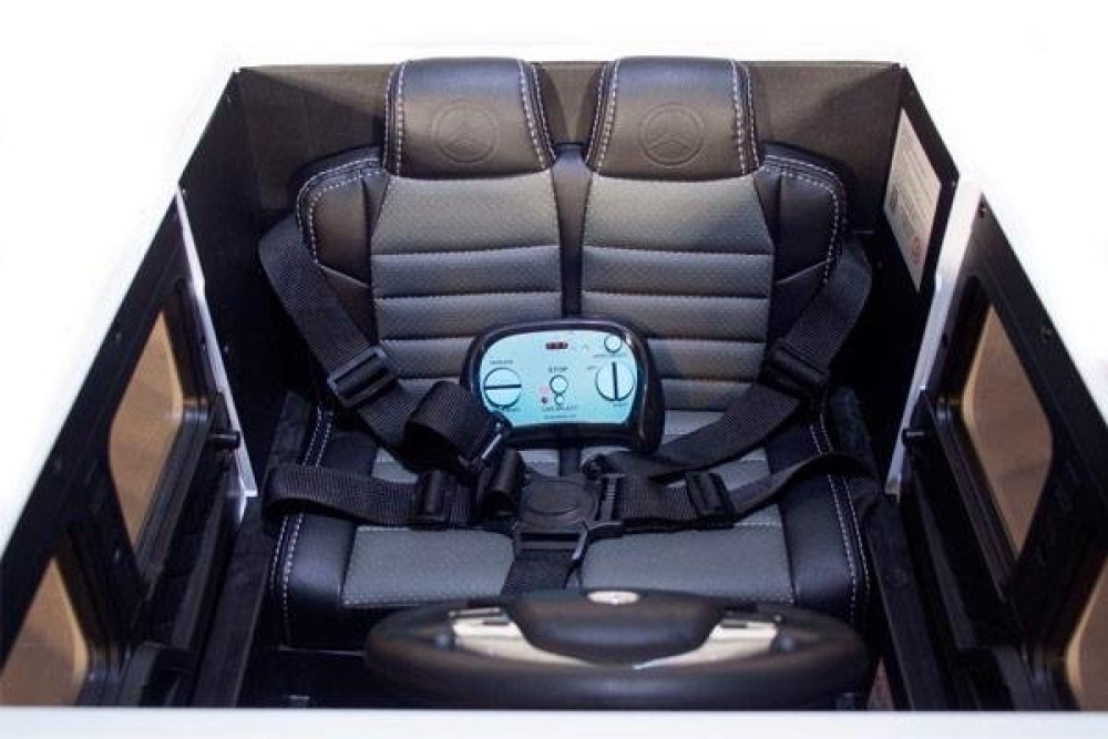 Электромобиль для детей Merсedes-Benz G63 AMG Black оснащен заднимим амортизаторами для плавности хода. Запас хода рассчитан на 2 часа катания, установлен быстросъемный аккумулятор емкостью 7ah (2шт). Максимальная нагрузка до 35кг, для детей до 6 лет. Имеет 2 посадочных места, кожаые сиденья и ремни безопасности. Для того чтобы завести автомобиль нужно нажать на кнопку Start/Stop. При нажатии на педаль газа, машина едет вперед, тормозит, если ее отпустить. Имеет 2 режима скорости. Автомобилем можно управлять дистанционно с помощью пульта, дальность срабатывания до 50 м. Из преимущество стоит вделить: