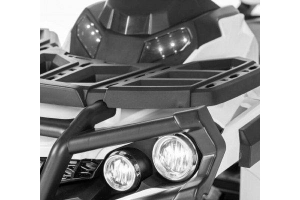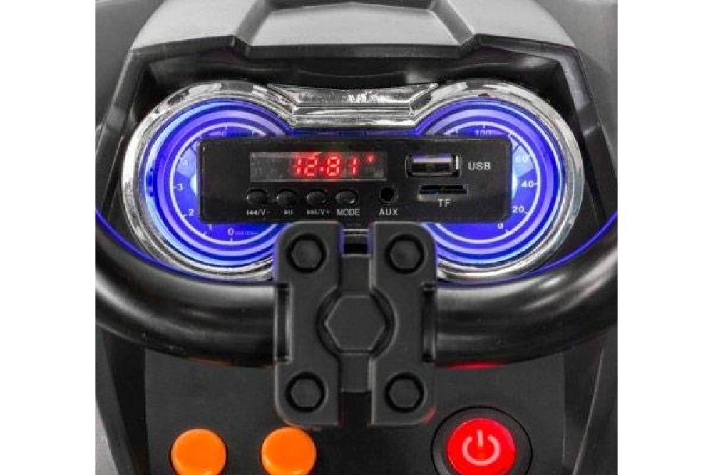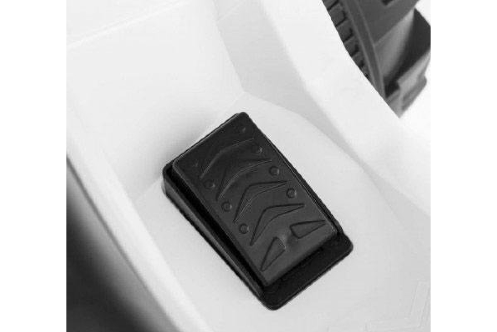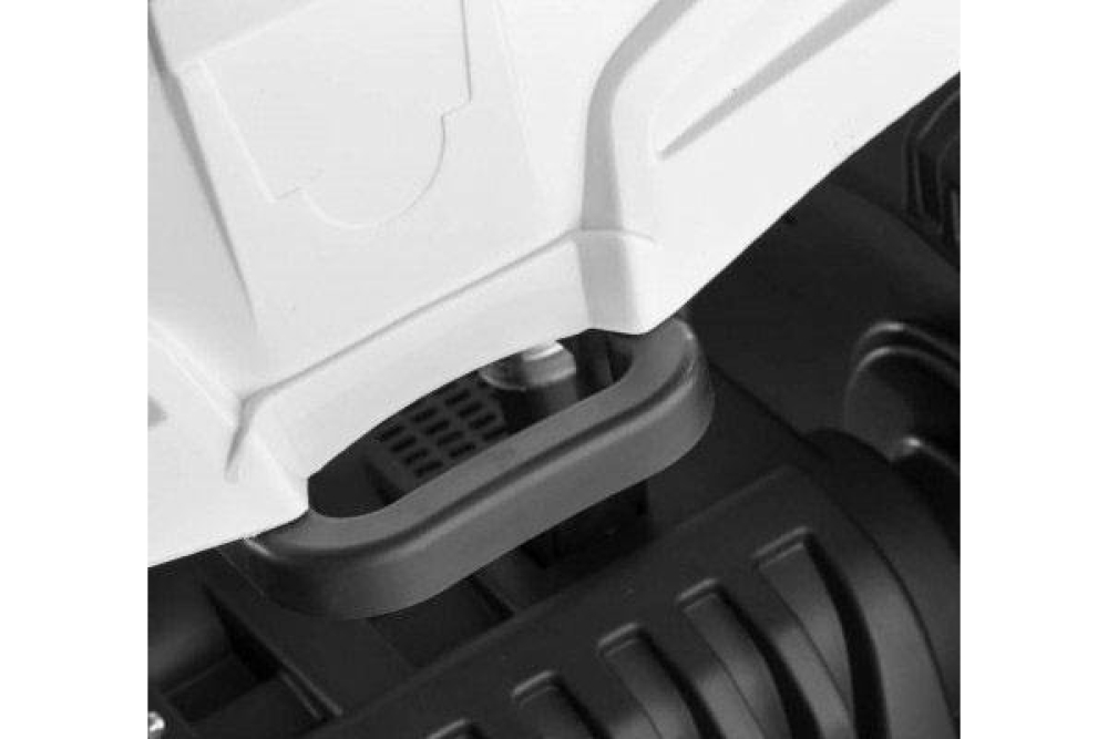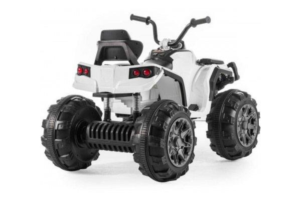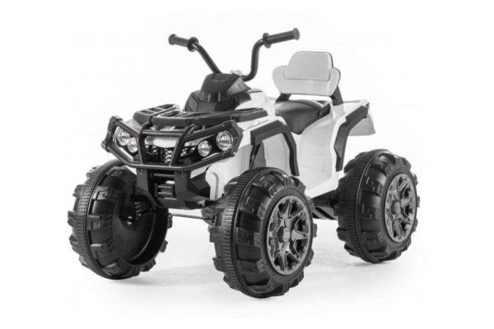 Данный квадроцикл фирменного белого цвета для детей имеет 2 передних скорости (3 и 7 км/ч) и одну заднюю. Колеса большие и выполнены и мягкой резины с глубоким протектором, чтобы преодолевать настоящее бездорожье. Для большей плавности стоят амортизаторы. В данной модели горят светодиодные фары, а для удобства водителя установлено кожаное сиденье и широкие подножки для максимальной устойчивости. Для того чтобы почувствовать себя королем дороги интегрирована мультимедийная система с FM радио, и возможностью подключения USB и SD носителей. Аккумулятора емкостью 7ah хватит чтобы проехать 2 часа. С приборной панели можно также включать предустановленные мелодии.