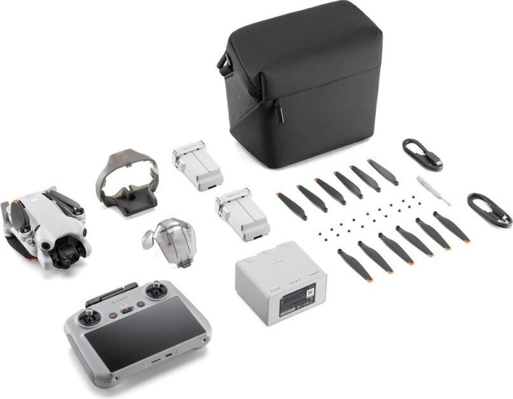 Комплект DJI Mini 4 Pro Fly More Combo с пультом дистанционного управления DJI RC 2, 3 интеллектуальных полетных батареи, 34 минут полетного времени, зарядная станция, наплечная сумка и другие компоненты.