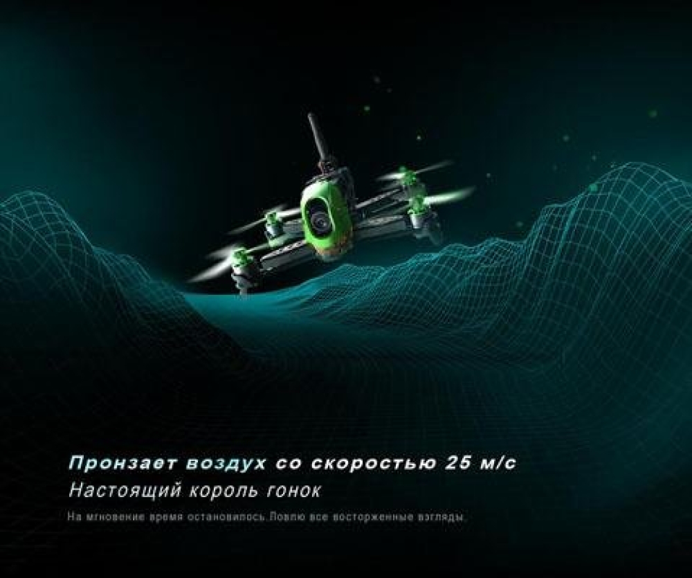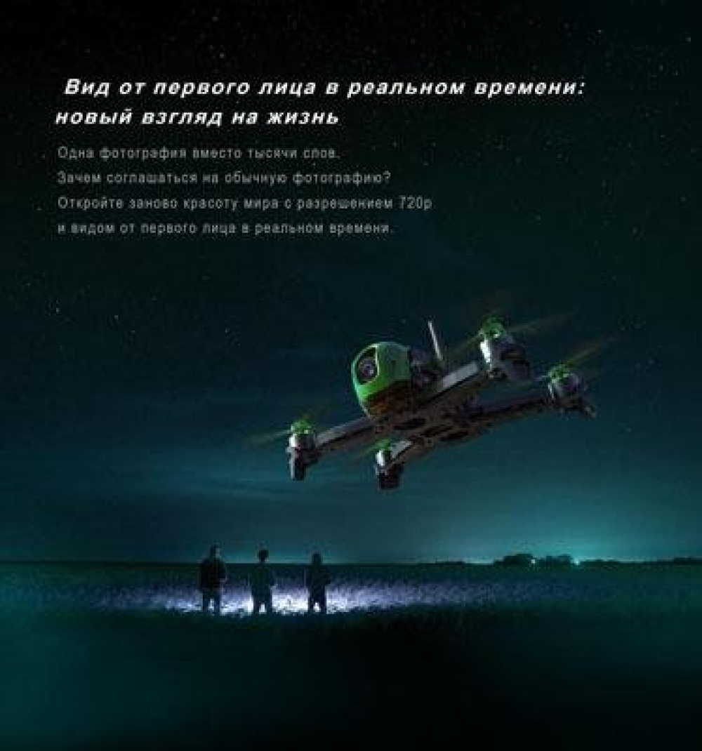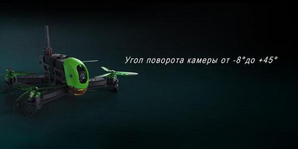 - FPV работает на частоте 5.8G и имеет дистанцию трансляции до 500 метров