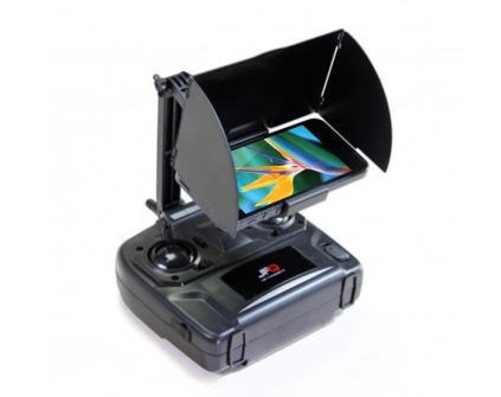 - Обновление коснулось важной для многих пилотов детали – дрон оснащен функцией First Person View. Это значит, что картинка, попадающая в объектив камеры, транслируется на экран смартфона или планшета. Для фиксирования устройства на дистанционном пульте управления, производитель включил в базовую комплектацию специальное крепление. В солнечный день рекомендуется использовать солнцезащитный козырёк;