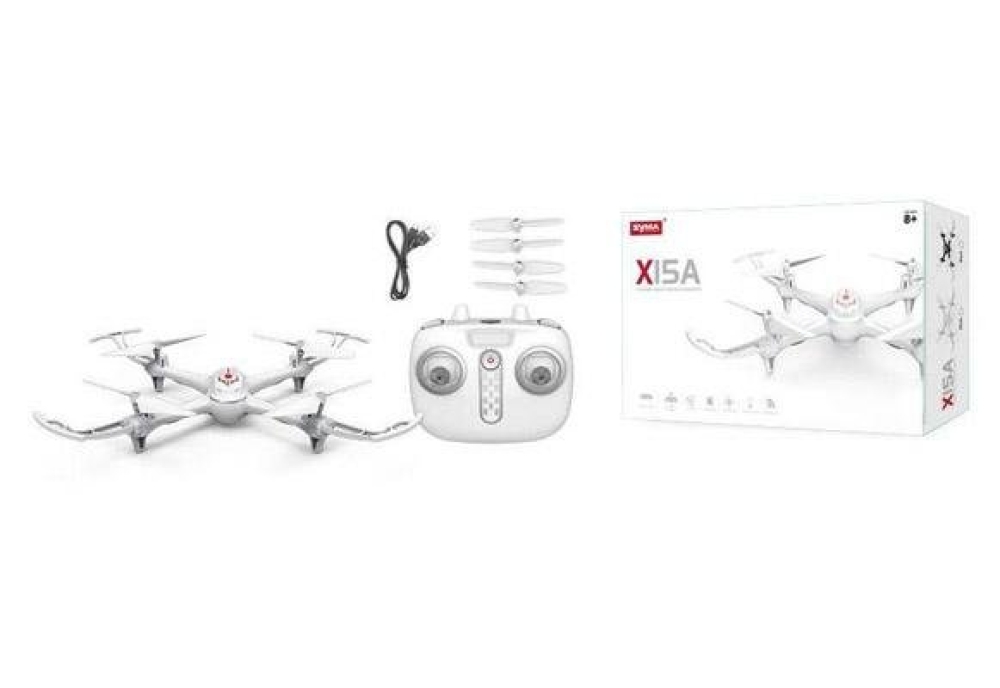 В комплекте: квадрокоптер Syma X15, пульт управления, 4 запасных лопасти, аккумулятор, USB зарядное устройство, отвертка, инструкция