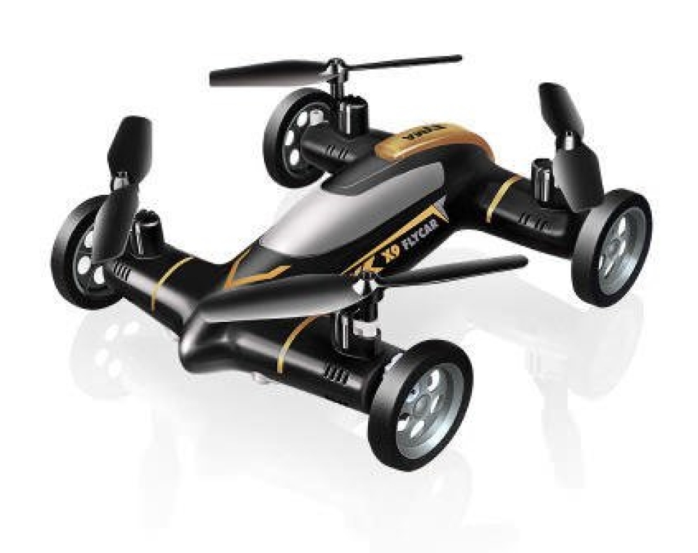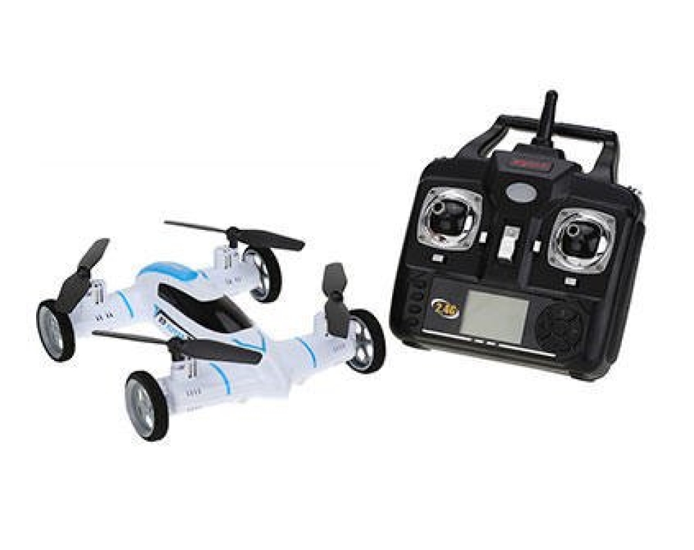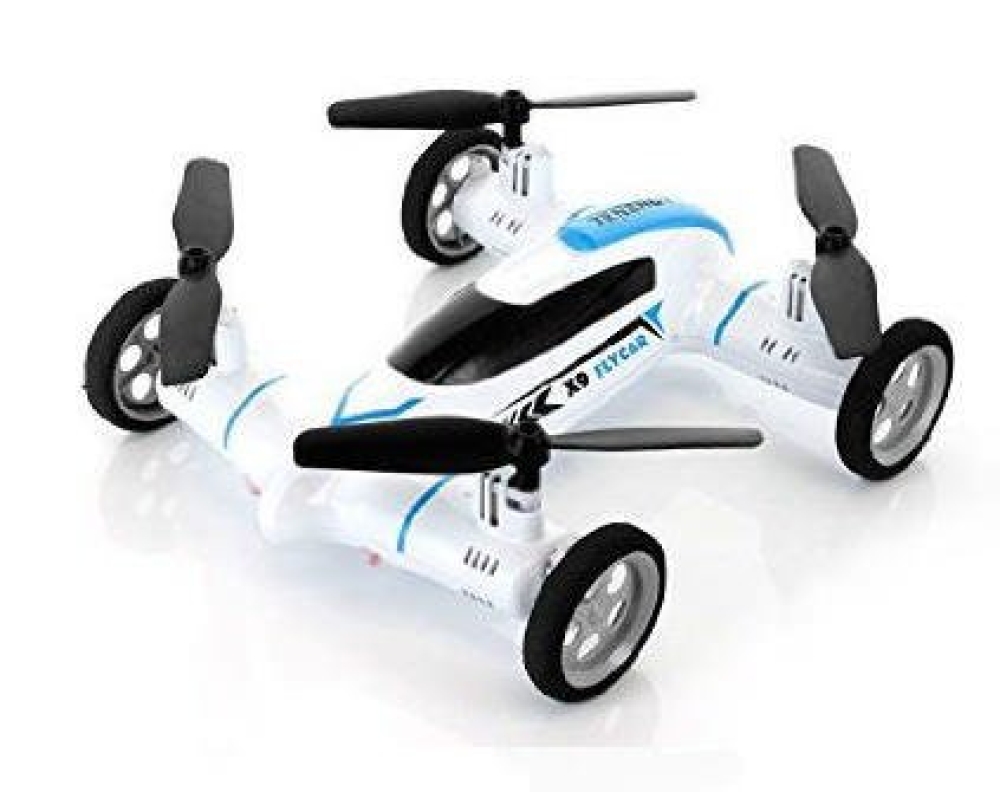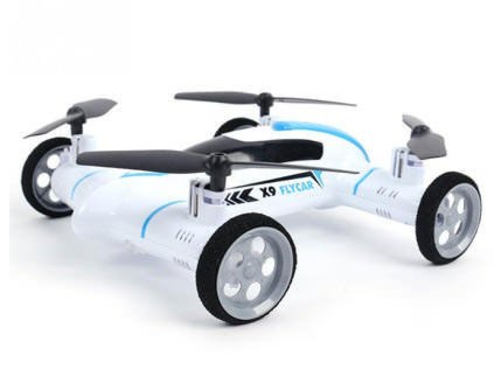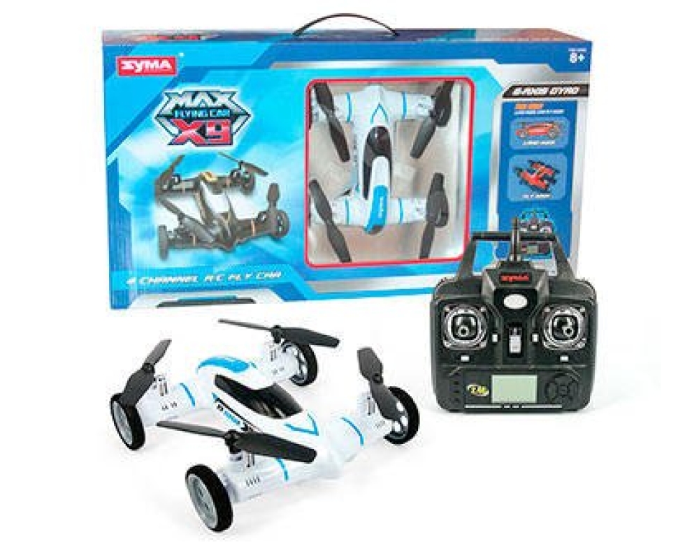 Квадрокоптер Syma X9 - интересный коптер, который может использоватсья еще и как автомобиль. Если использовать правый джойстик то модель будет ездить по земле и поворачивать, но стоит начать использовать стик газа и квадрокоптер тут же взлетит, превратившись в полноценный четырех канальный квадрокоптер. Взлететь и посадить эту дрон-машинку не составит труда, так как само управление простое. Как и обычные модели умеет делать флипы, т.е. перевороты на 360 градусов. Время игры с таким гибридом составит примерно 12 минут на одном заряде. Дальность сигнала достигает 80 метров.