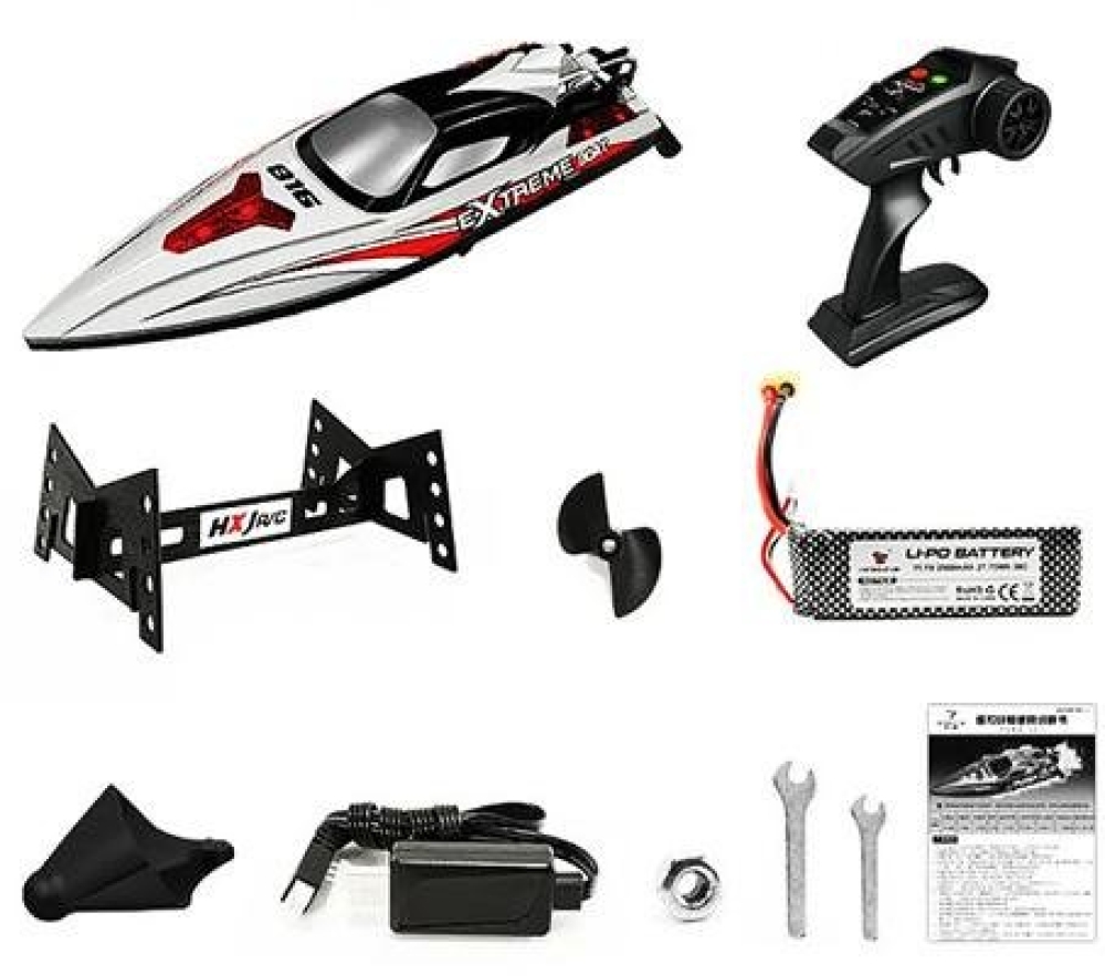В комплект входят собранный катер, пульт управления, зарядное устройство, аккумулятор, запасной винт, бампер (для защиты от столкновений), инструкция.