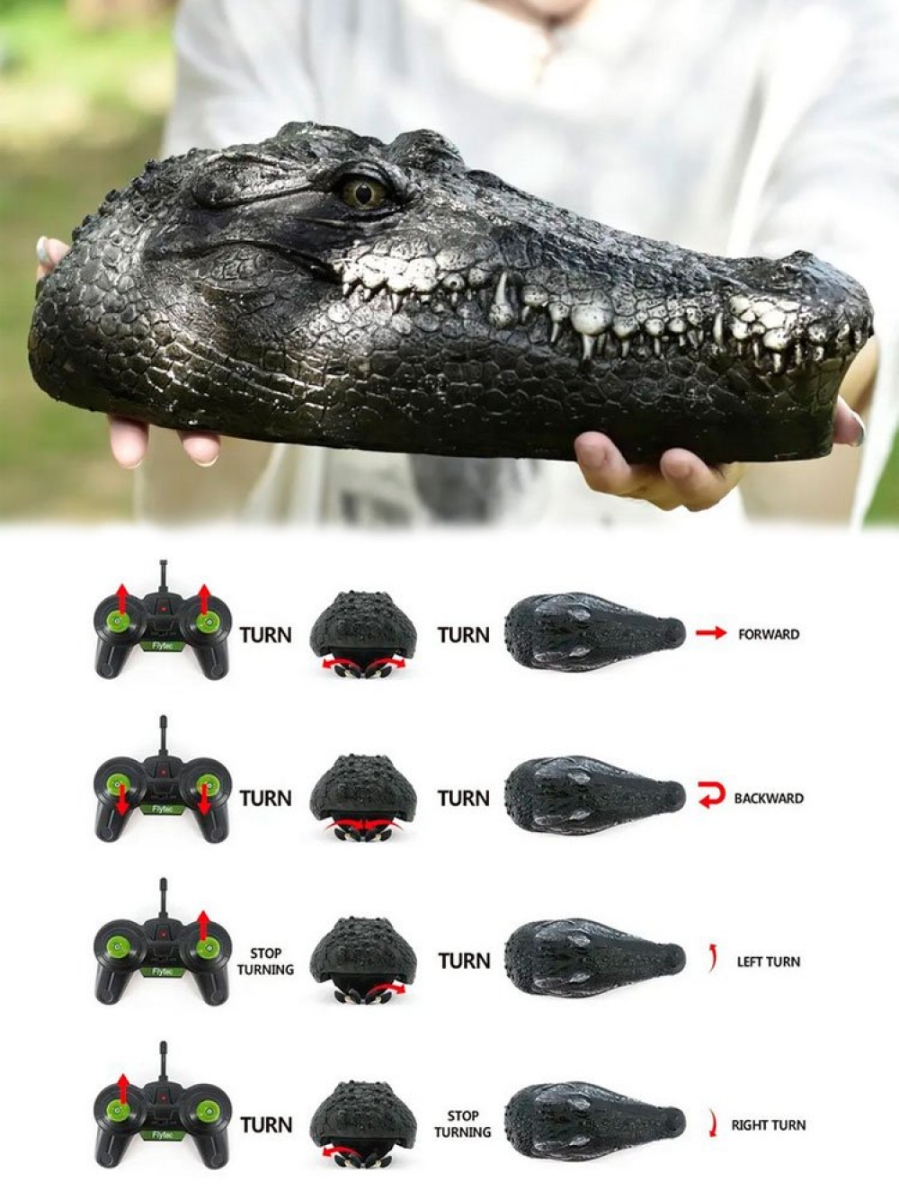 - 2 канала обеспечивают движение вперед и назад, поворот влево и вправо, имитируют скорость и движение настоящего крокодила, свободно плавающего в воде.