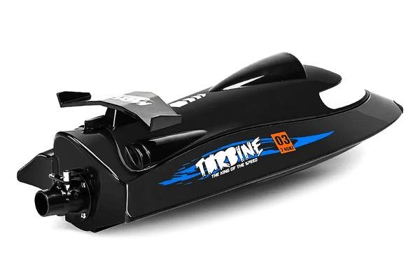 Радиоуправляемый скоростной катер Flytec V009 2.4G RTR - это гоночный катер с коллекторным двигателем 390 класса, оснащенный водометным двигателем, одновременно обеспечивающим высокую мощность толчка водяной струи при движении, и предотвращающим опрокидывание корпуса на 180 градусов. Цвет данной модели - чёрный, есть синие и оранжевые декали.