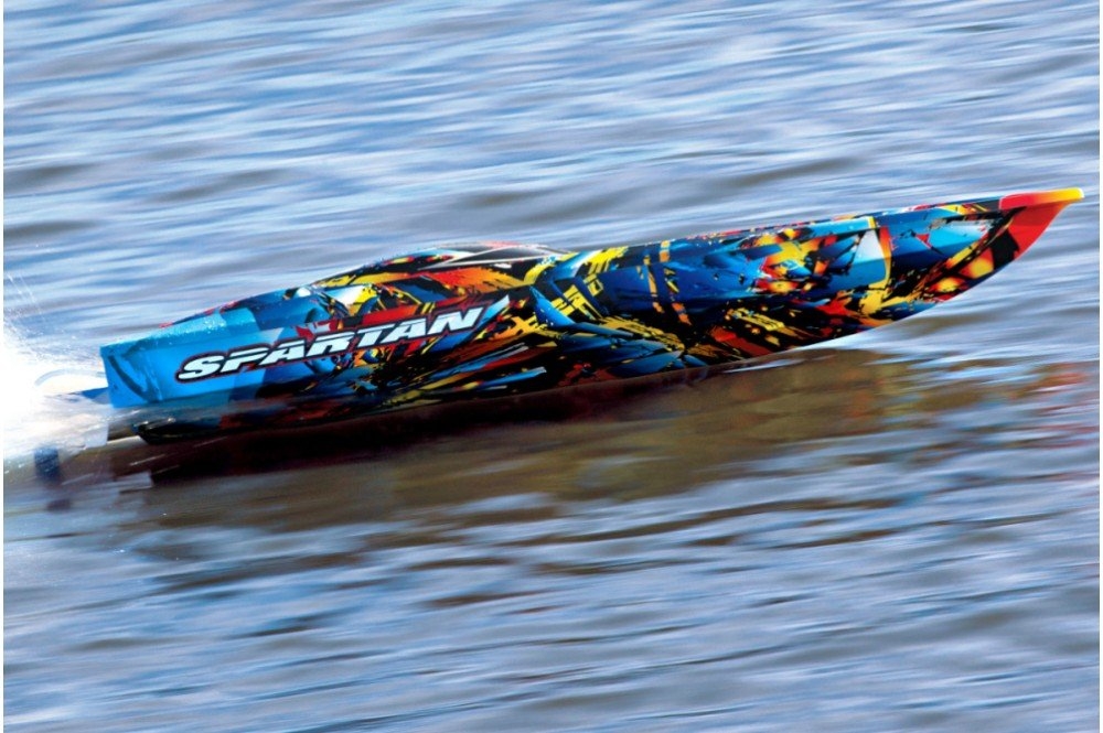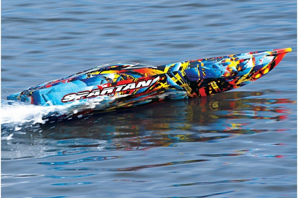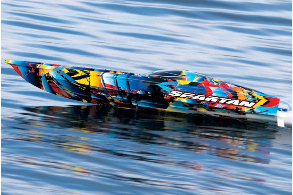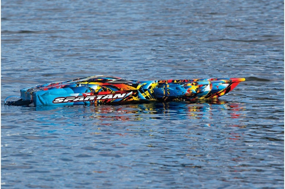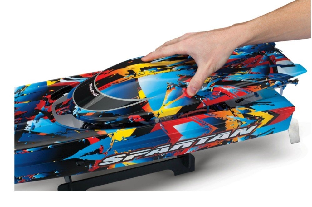 Внутри модели вся электроника защищена от попадания влаги, Вас это не должно отвлекать от завораживающих впечатлений и получения удовольствия от заплывов. Мощная силовая система, установленная на Traxxas Spartan, даёт потрясающую динамику, а благодаря прекрасно сбалансированной форме корпуса модель управляется просто изумительно. Поразите окружающих резкими ускорениями и разворотами, ведь на такую маневренность, способны немногие радиоуправляемые катера. Spartan оснащается системой курсовой устойчивости Traxxas TSM.Он изготовлен из двухслойного ABS–пластика. При высокой жёсткости и стойкости к деформации удалось избежать весовых издержек, характерных для корпусов из стеклопластика, что обеспечивает впечатляющие динамические характеристики и более уверенный выход на глиссирование. Свободные отсеки катера заполнены пенопластом, что дополнительно повышает прочность и помогает избежать затопления. Наиболее нагруженные участки корпуса усилены специальными плоскими накладками, таким образом удалось избежать установки дополнительных шпангоутов. Обеспечен лёгкий доступ ко всей установленной на модели электронике.