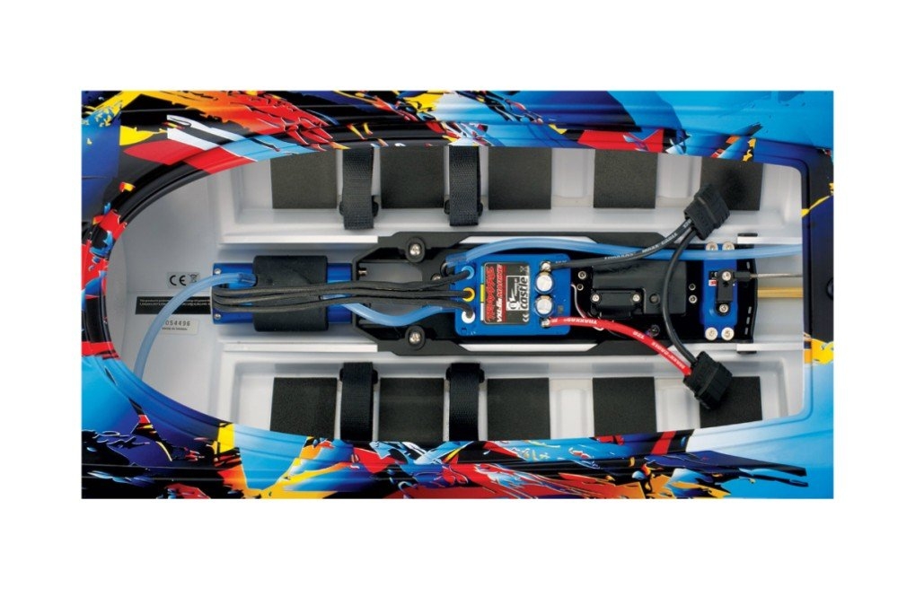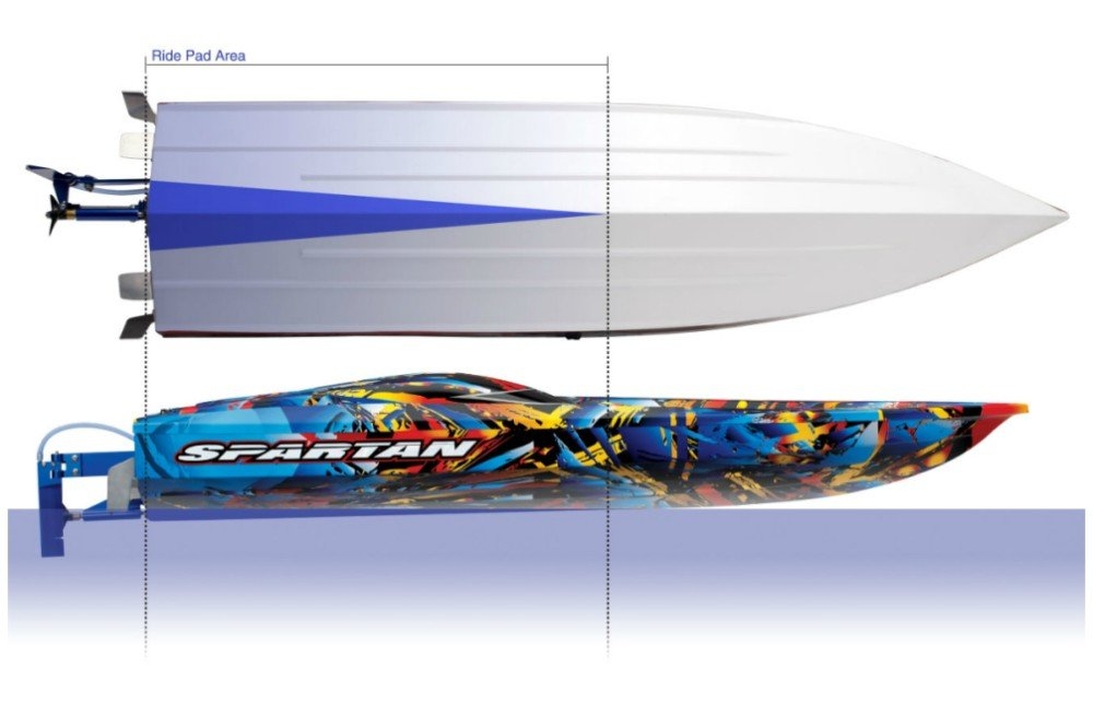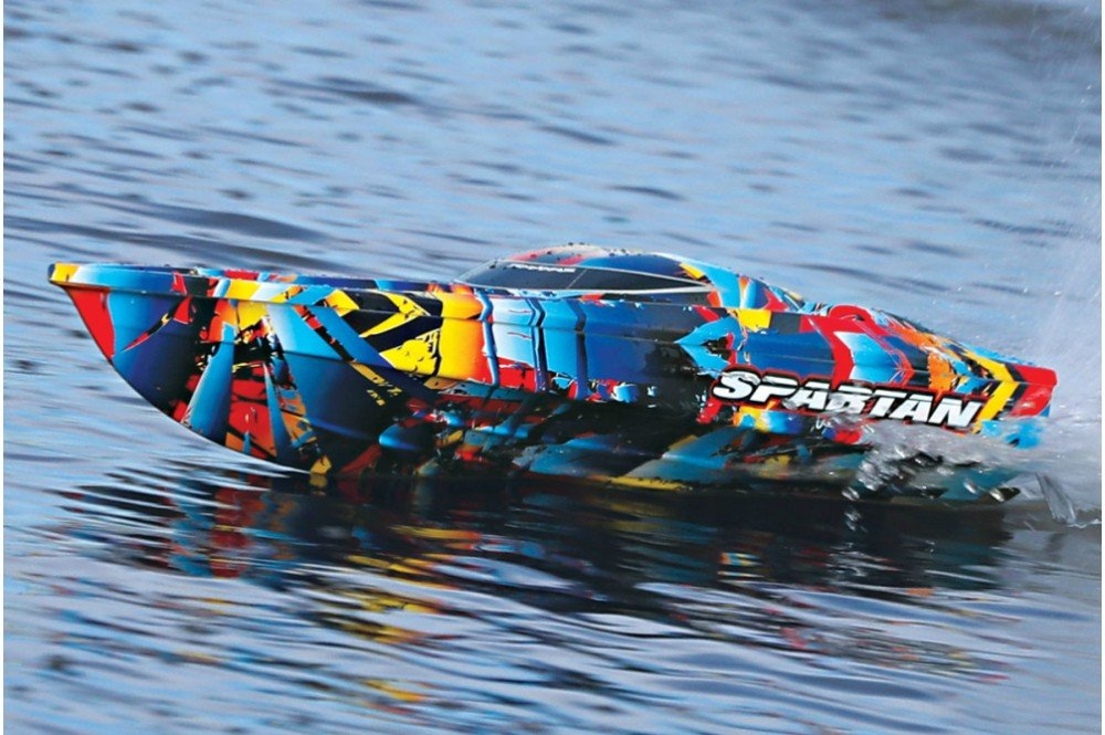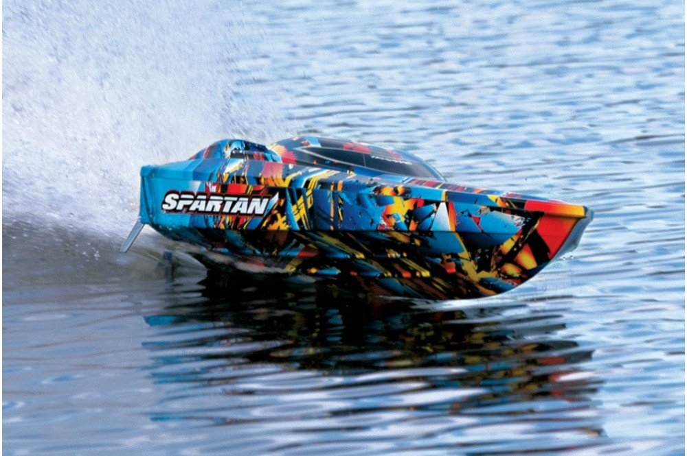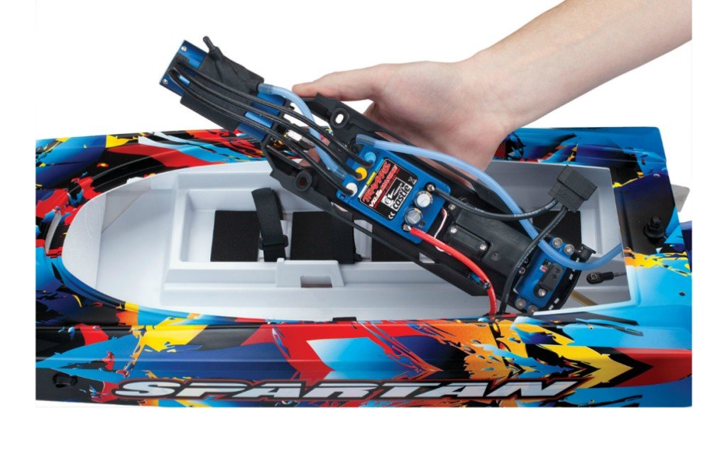 Внутри модели вся электроника защищена от попадания влаги, Вас это не должно отвлекать от завораживающих впечатлений и получения удовольствия от заплывов. Мощная силовая система, установленная на Traxxas Spartan, даёт потрясающую динамику, а благодаря прекрасно сбалансированной форме корпуса модель управляется просто изумительно. Поразите окружающих резкими ускорениями и разворотами, ведь на такую маневренность, способны немногие радиоуправляемые катера. Spartan оснащается системой курсовой устойчивости Traxxas TSM.Он изготовлен из двухслойного ABS–пластика. При высокой жёсткости и стойкости к деформации удалось избежать весовых издержек, характерных для корпусов из стеклопластика, что обеспечивает впечатляющие динамические характеристики и более уверенный выход на глиссирование. Свободные отсеки катера заполнены пенопластом, что дополнительно повышает прочность и помогает избежать затопления. Наиболее нагруженные участки корпуса усилены специальными плоскими накладками, таким образом удалось избежать установки дополнительных шпангоутов. Обеспечен лёгкий доступ ко всей установленной на модели электронике.