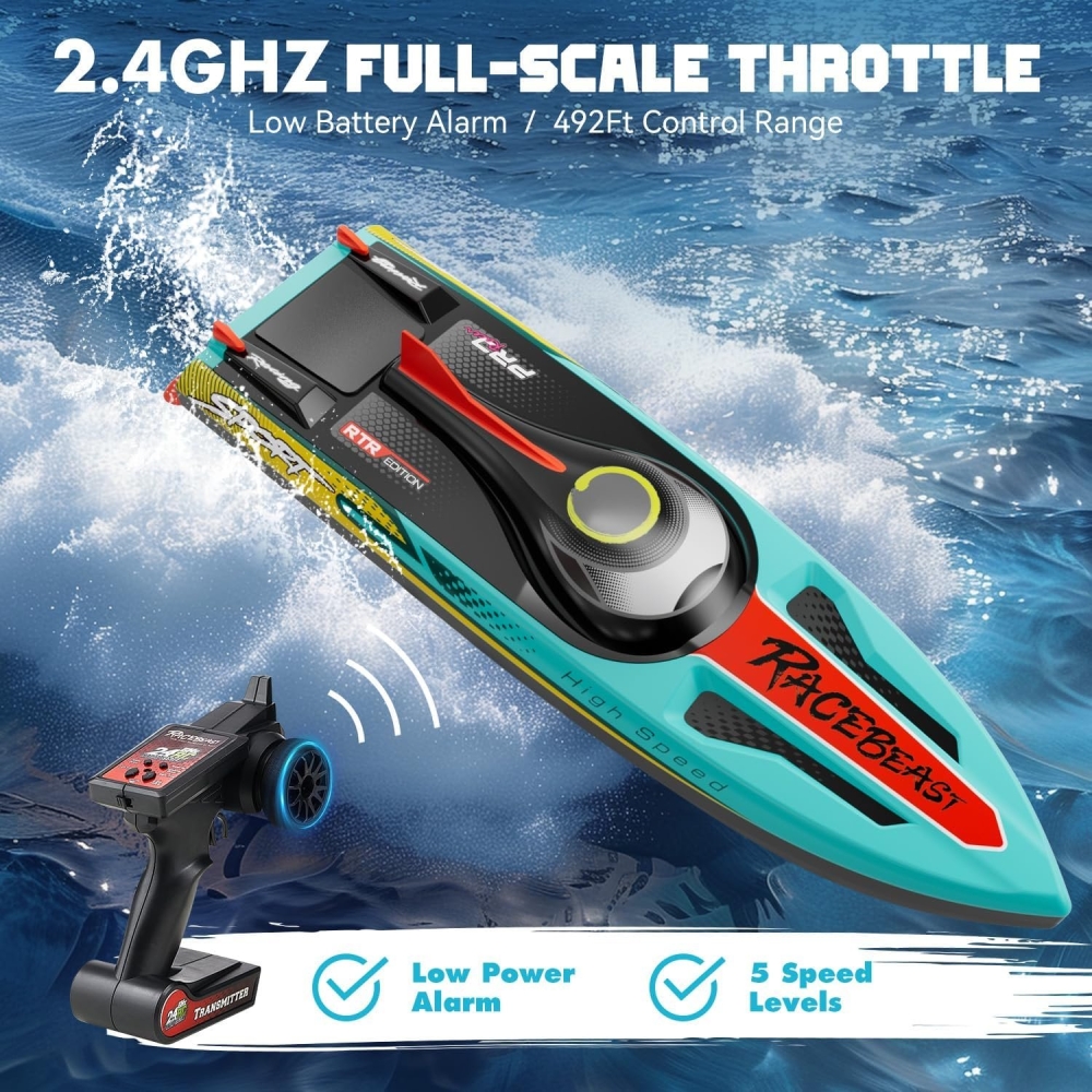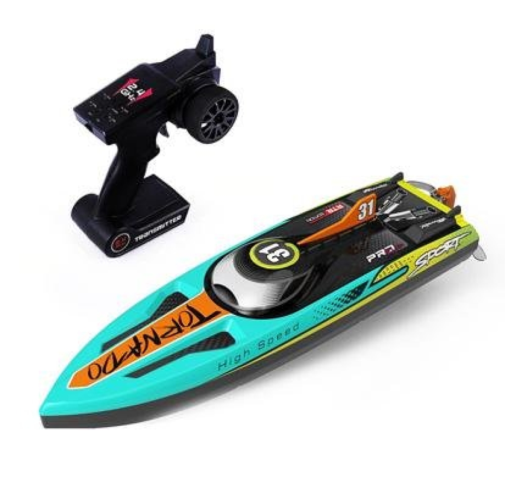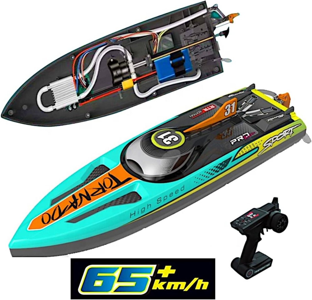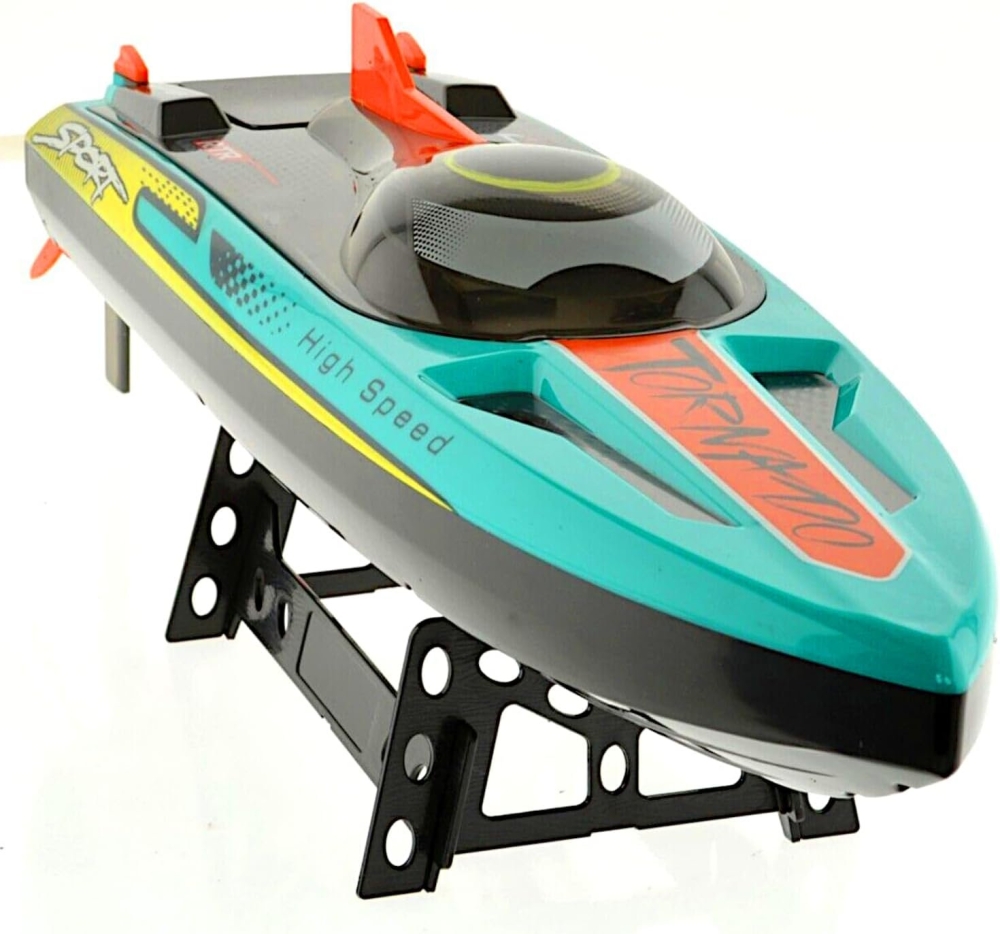 В комплекте идет всё что нужно - Вам нужно только зарядить аккумулятор и установить батарейки в пульт. Аппаратура управления с частотой 2,4 ГГц позволяет управлять катером в радиусе 150 метров. Скорость катера впечатляющая - более 65 км/ч.