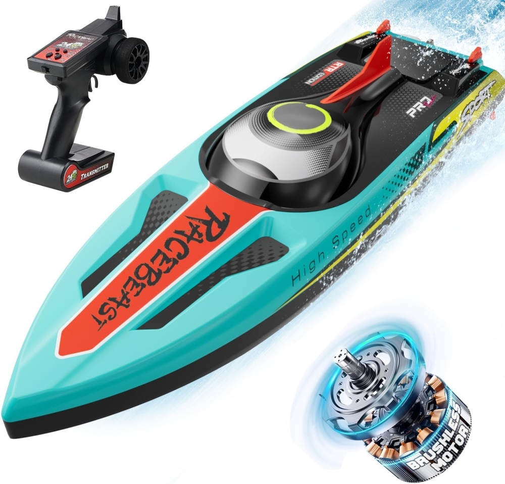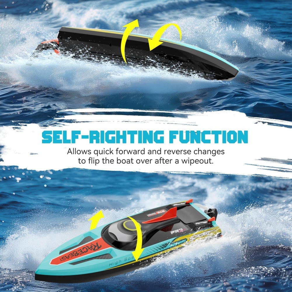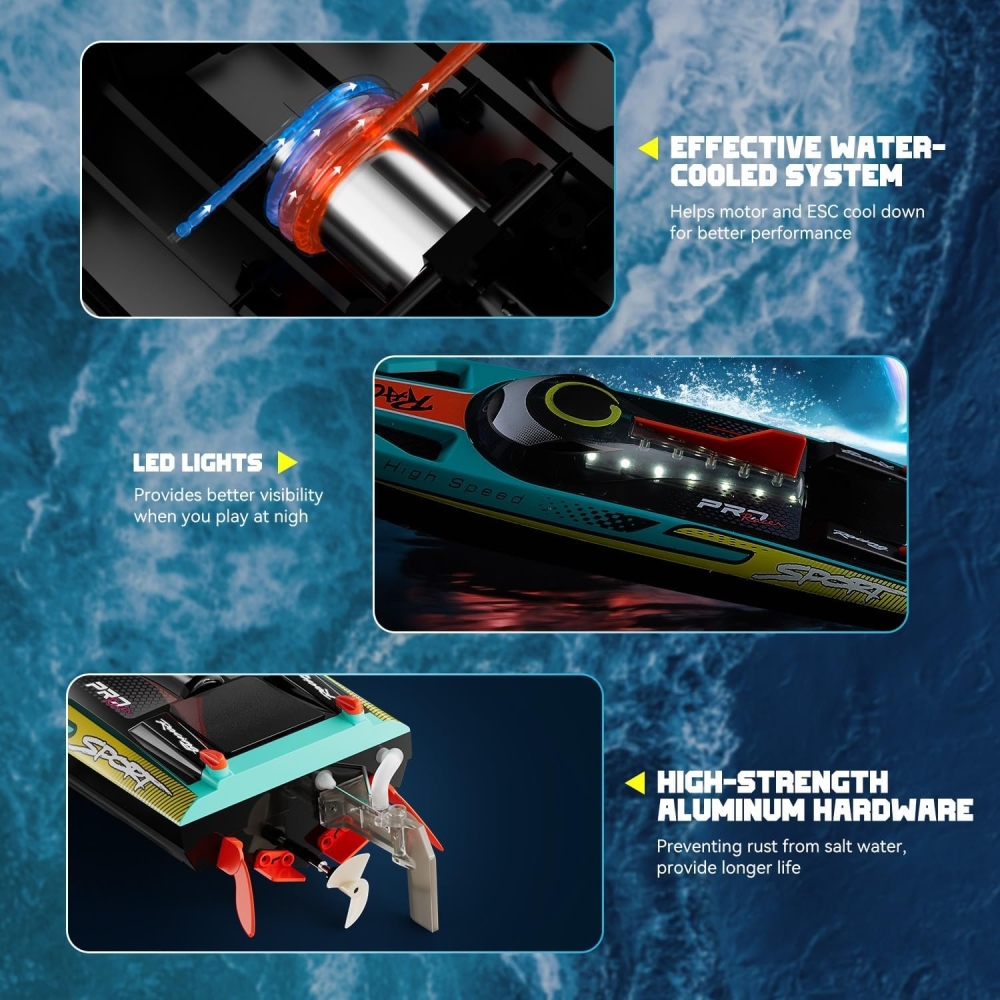В комплекте идет всё что нужно - Вам нужно только зарядить аккумулятор и установить батарейки в пульт. Аппаратура управления с частотой 2,4 ГГц позволяет управлять катером в радиусе 150 метров. Скорость катера впечатляющая - более 65 км/ч.