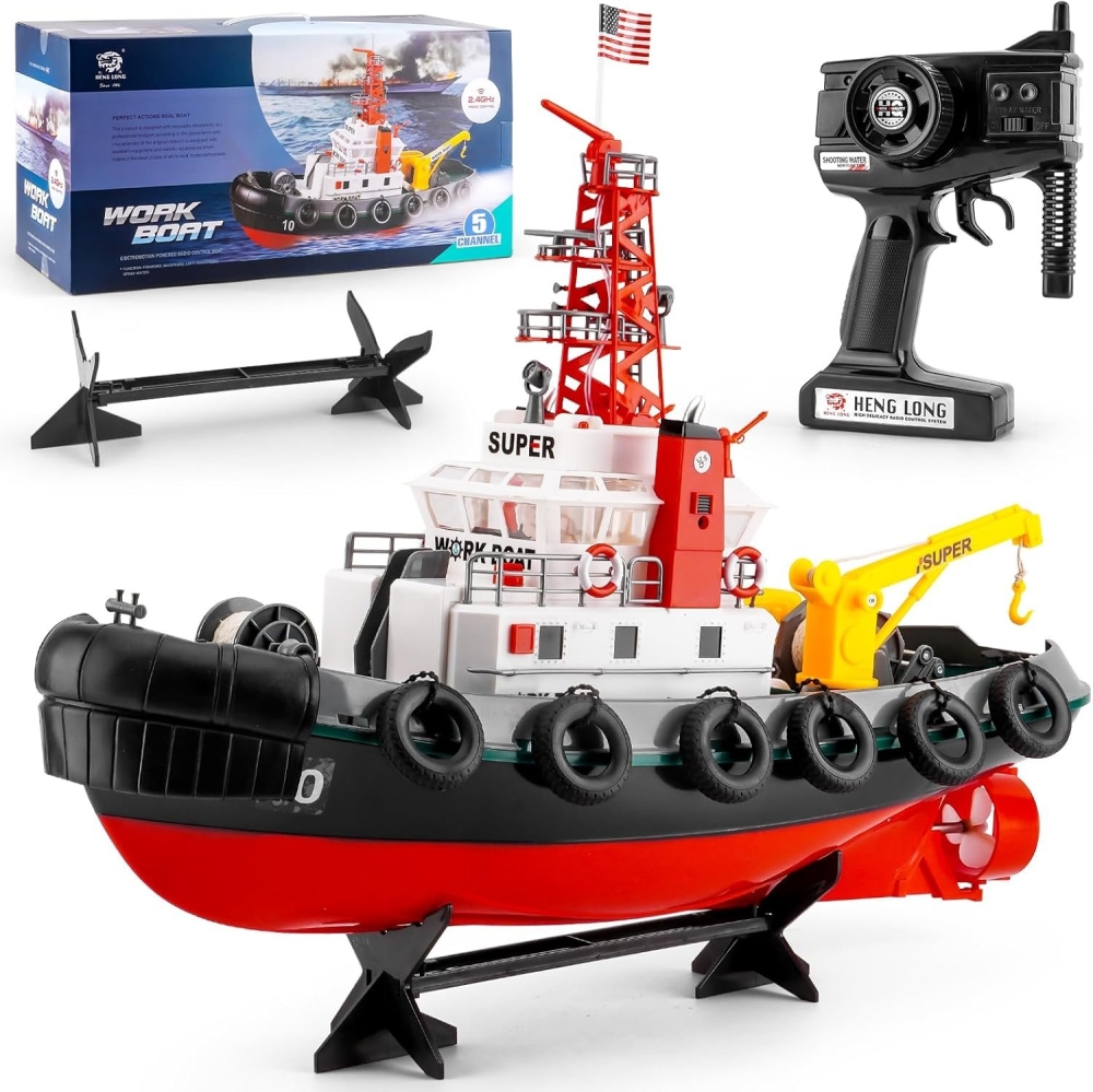 Большой высоко детализированный буксир на пульте управления. С помощью лебедки вы сможете разгружать и перемещать небольшие грузы. Буксир имеет мощный коллекторный мотор, поэтому вы сможете осуществлять транспортировку других судов. По бортам подели расположены автомобильные покрышки чтобы можно было заталкивать большие плавучие объекты в узких гаванях или к пристаням. Дополнительно оснащен также лебедкой на носу.