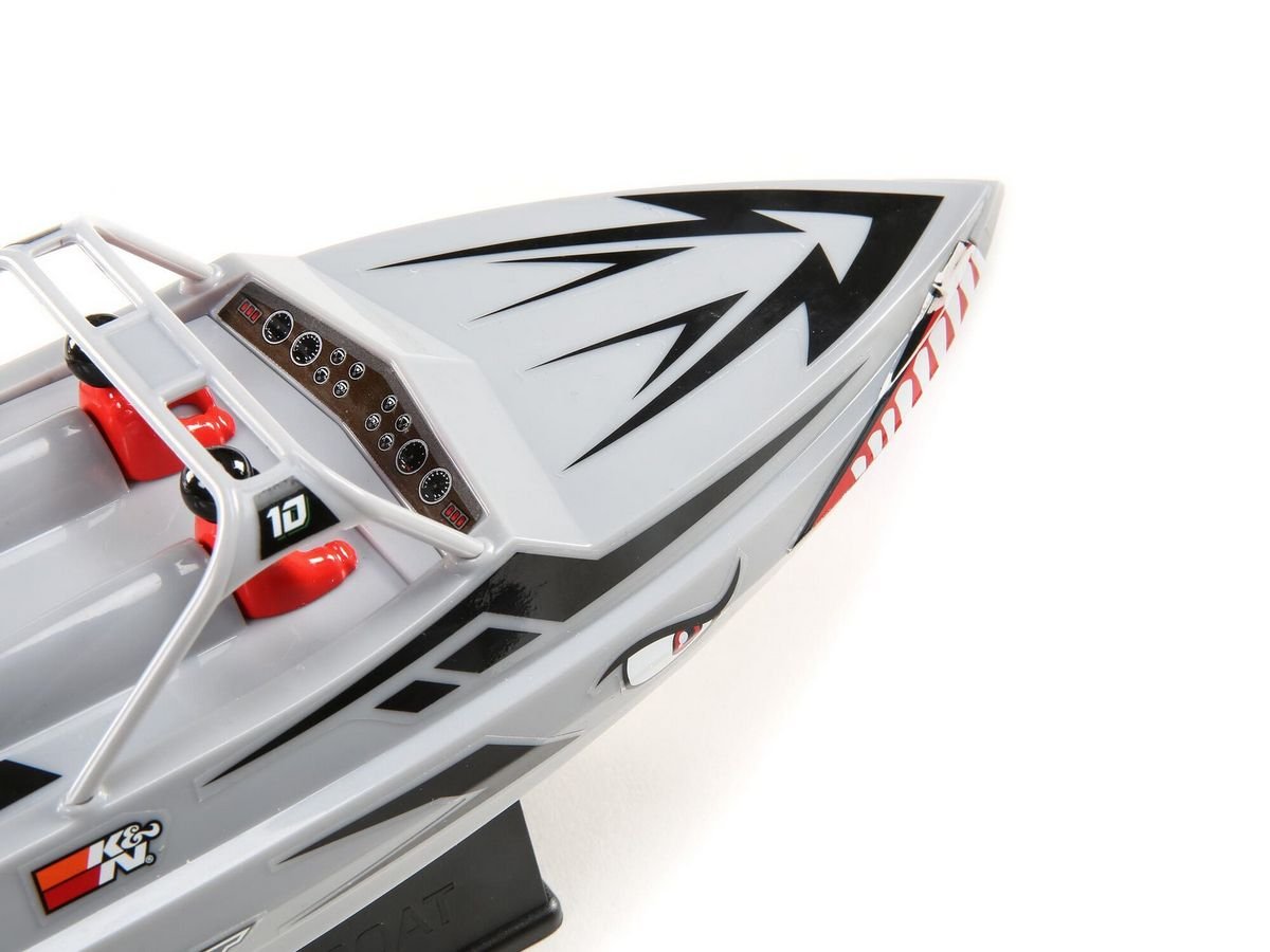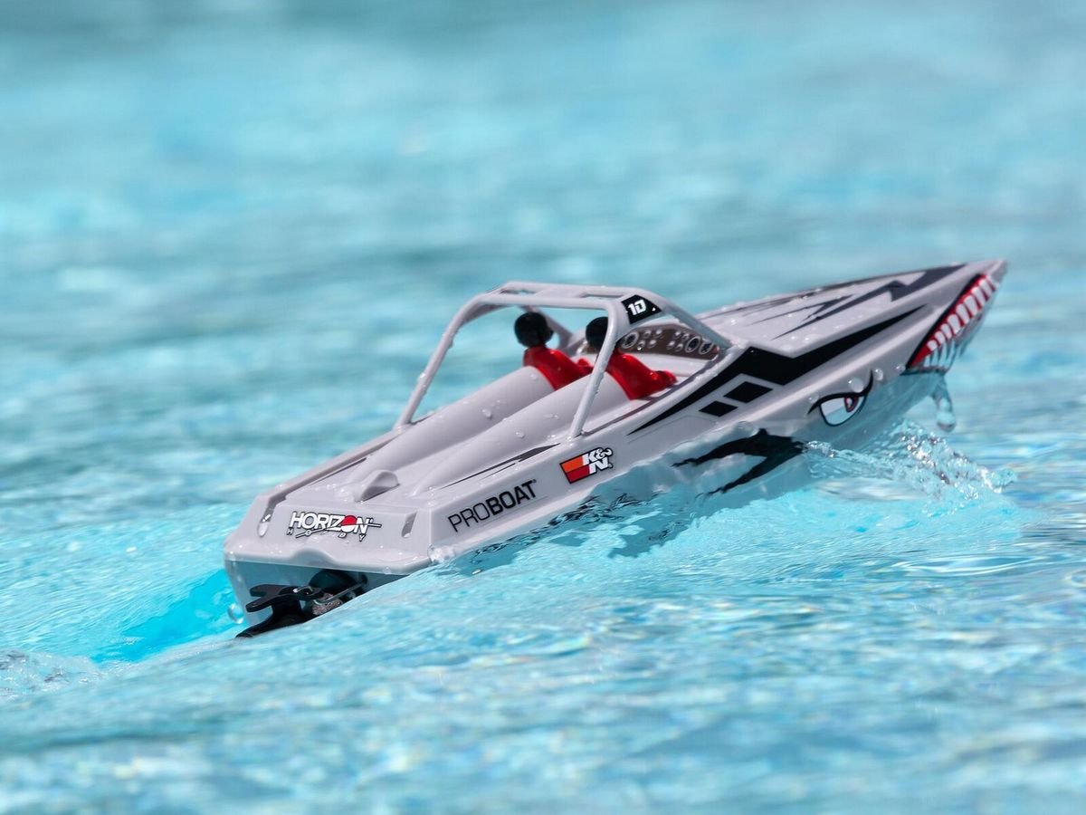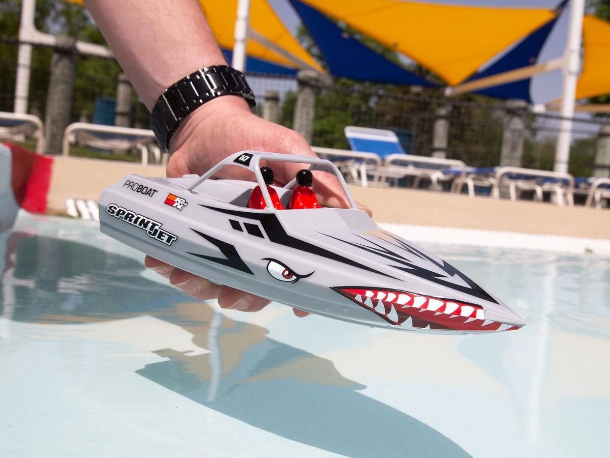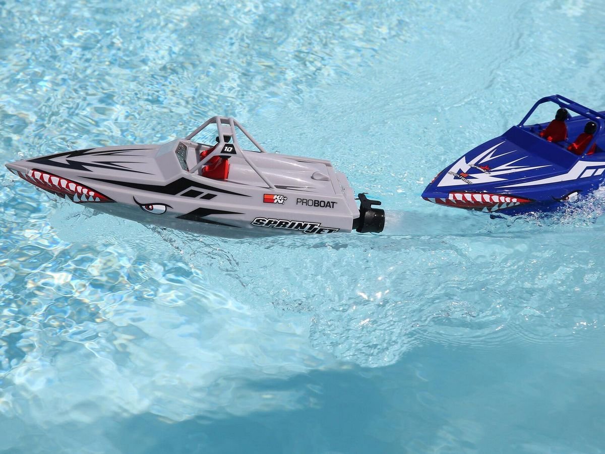 Небольшой радиоуправляемый катер ProBoat Sprintjet 9" длиной около 23 см. Оснащён водомётным электродвигателем. Если катер перевернулся в воде, он сам перевернется обратно в нормальное положение.