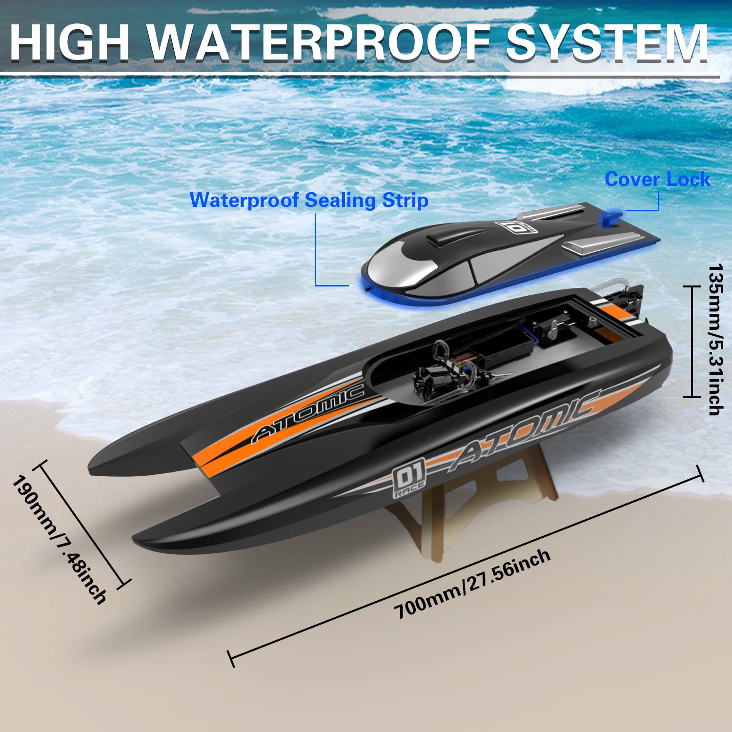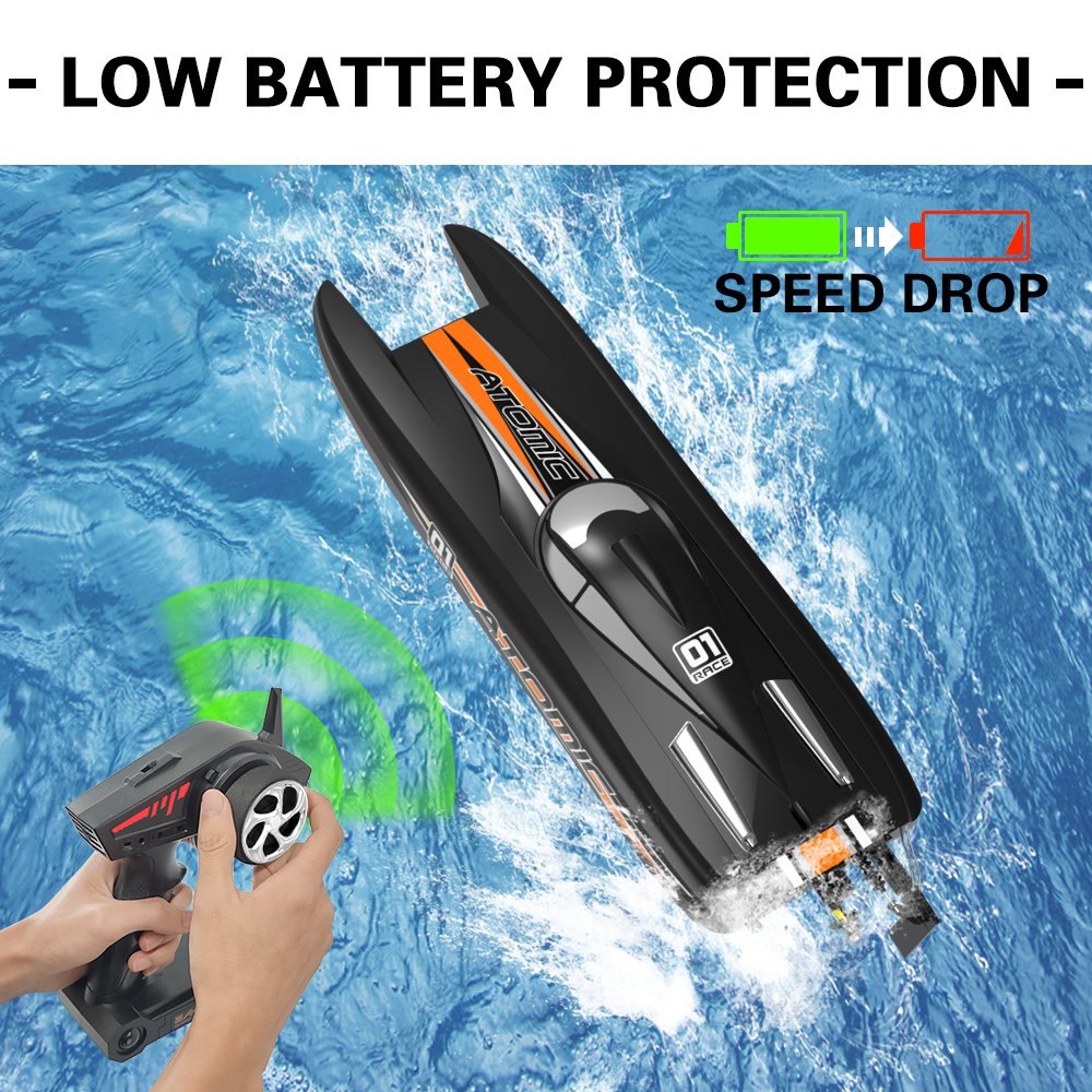 Гоночный радиоуправляемый катер Volantex RC AtomicX, оснащенный мощным бесколлекторным мотором премиум-класса, способен мчаться со скоростью 40 миль в час! Это сверхбыстрая скорость сделает гонки интереснее и увлекательнее
